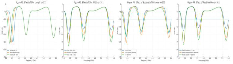 Slot Length (Fig.11a): Varying the slot length significantly influences the lower resonance. Increasing the slot length shifts the 2.4 GHz band to a lower frequency, while reducing it pushes the band upward. This parameter is thus critical for tuning the fundamental mode.
