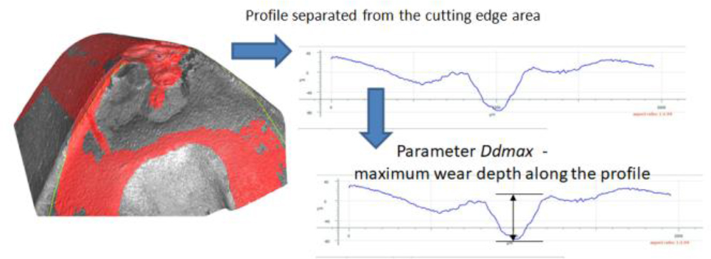 During cutting, reference measurements were taken and the tool position was corrected relative to the workpiece nominal and measured values. The measurement of the blade geometry in the worn state was verified by the Alicona G6 measuring system using the Advance Focus Variation method [17]. In the Alicona Edge Master Module 10.5 program, the Ddmax parameter values (maximum wear depth along the profile determined on the cutting edge) were determined, which enabled the assessment of the blade shortening (Fig. 6). These values will be used to verify whether the measurements of the workpiece and the total corrections in the process define the tool wear, as determined by the parameter Ddmax.