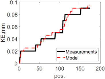The strategy for determining and fine-tuning the models was verified using experimental data from a real production process in the Intelligent Tool Change System. For the manufacturing process being carried out, based on workpiece measurements taken every 5 pieces, corrections were made using the adaptive linear model. The model was fine-tuned as new measurements were received and predicted the cutting edge reduction values based on a monotonic function model with an increment of 5 μm. The prediction and actual measurements were in high agreement. For the sample data from Figure 7, the goodness of fit index NRMSE for the model was 0.2674, and after averaging, it was 0.2187 (Tab. 4).