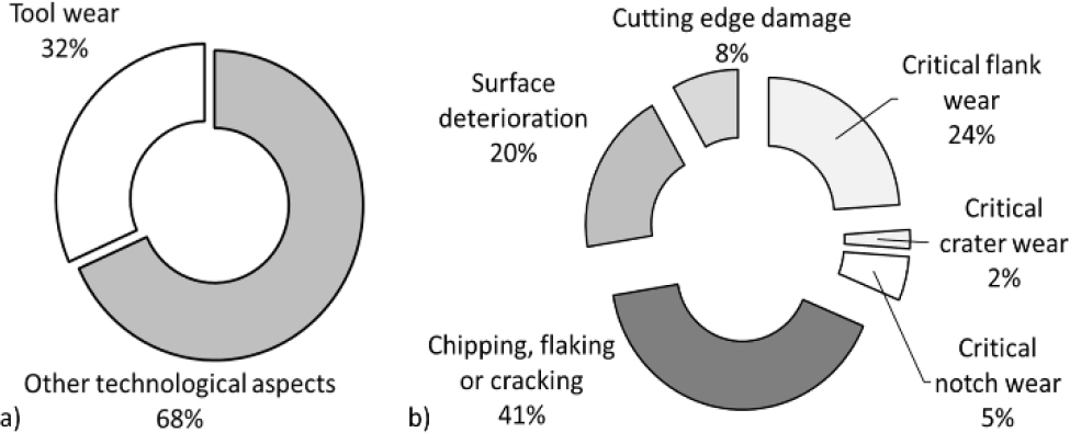 Many methods for tool wear assessment have been developed [6], with most focusing on identifying critical wear indicators, as summarized in Tab. 1. The data in Tab. 1 were obtained from research by D&H Innovations Ltd. and D&H Engineering Ltd. between 2021 and 2023. Certain wear types involve accelerated degradation of the cutting blade beyond technologically justified limits. However, such occurrences are rare, happening in less than 1% of all tool changes, a rate even lower than other operational events like retooling. This low incidence highlights the reliability of existing wear patterns and supports the feasibility of developing accurate tool wear models. These models can be confidently implemented in production to improve monitoring, optimize tool usage, and reduce unexpected downtime.