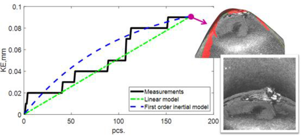 Fig. 7 shows an example of a single cutting process, in which the collected reference data of the tool wear for 75% of the critical value. The reference data were modelled with a linear model and a first-order inertial model. For this specific cutting case, the linear model seems to be a better fit than the first-order inertial model. The fit was similar for the linear model and the first-order inertial model. However, statistically for the entire experiment, the results for the first-order inertial model indicated its advantage over the linear model.