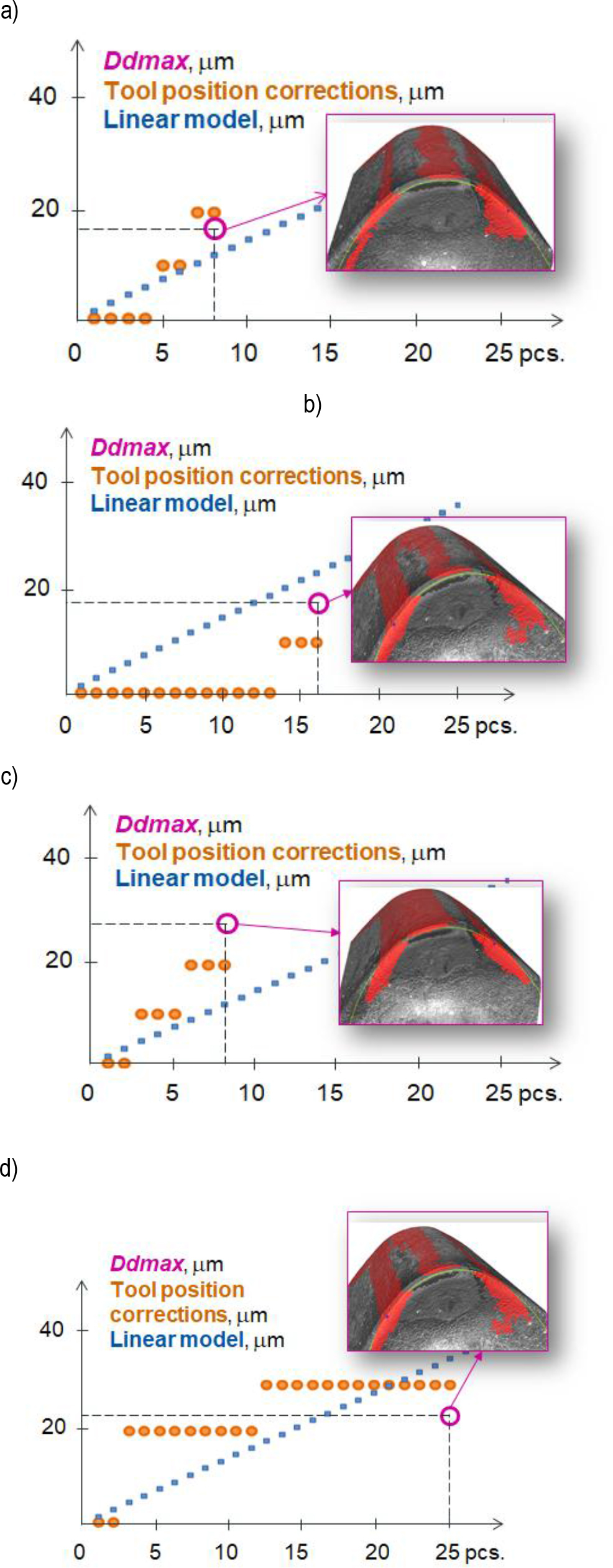 Despite the good fit of the models, it can be observed that the measured values and the values estimated by the models, when compared to the reference value under narrow tolerance conditions, do not ensure complete compliance of the items with the specification. To perform a more comprehensive analysis, Fig. 7 presents the measured value of Ddmax for selected experimental points (10% of the critical wear value) along with the cumulative value of tool position corrections. The value of Ddmax and the cumulative value of the tool position correction, adjusted for the current measurement value, remain in high agreement, which was confirmed by a statistical test for equality of means. The plots in Fig. 8 have been supplemented with estimated cutting edge reduction values for the linear model. The linear model was determined using the least squares method based on all the measured data.
