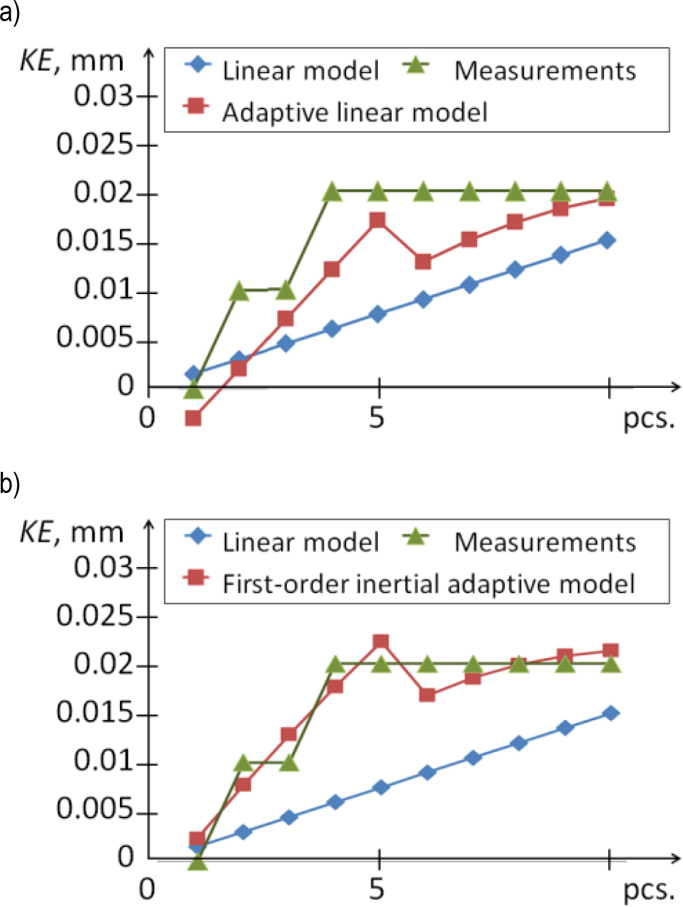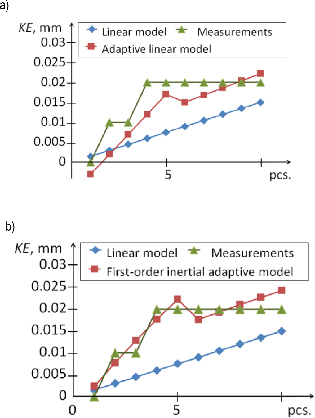 A comparison of tool wear measurements and data generated using the linear model and the adaptive linear model (a) and first-order inertial adaptive model (b), as reference data for tool position correction, considering a smoothing window for the first 10 pieces