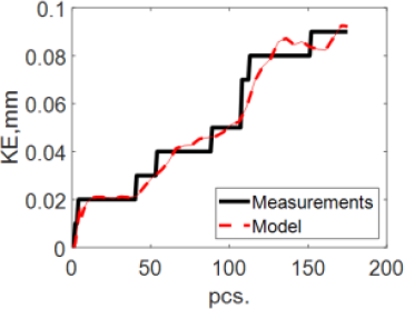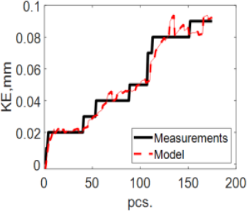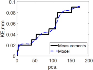 The strategy for determining and fine-tuning the models was verified using experimental data from a real production process in the Intelligent Tool Change System. For the manufacturing process being carried out, based on workpiece measurements taken every 5 pieces, corrections were made using the adaptive linear model. The model was fine-tuned as new measurements were received and predicted the cutting edge reduction values based on a monotonic function model with an increment of 5 μm. The prediction and actual measurements were in high agreement. For the sample data from Figure 7, the goodness of fit index NRMSE for the model was 0.2674, and after averaging, it was 0.2187 (Tab. 4).
