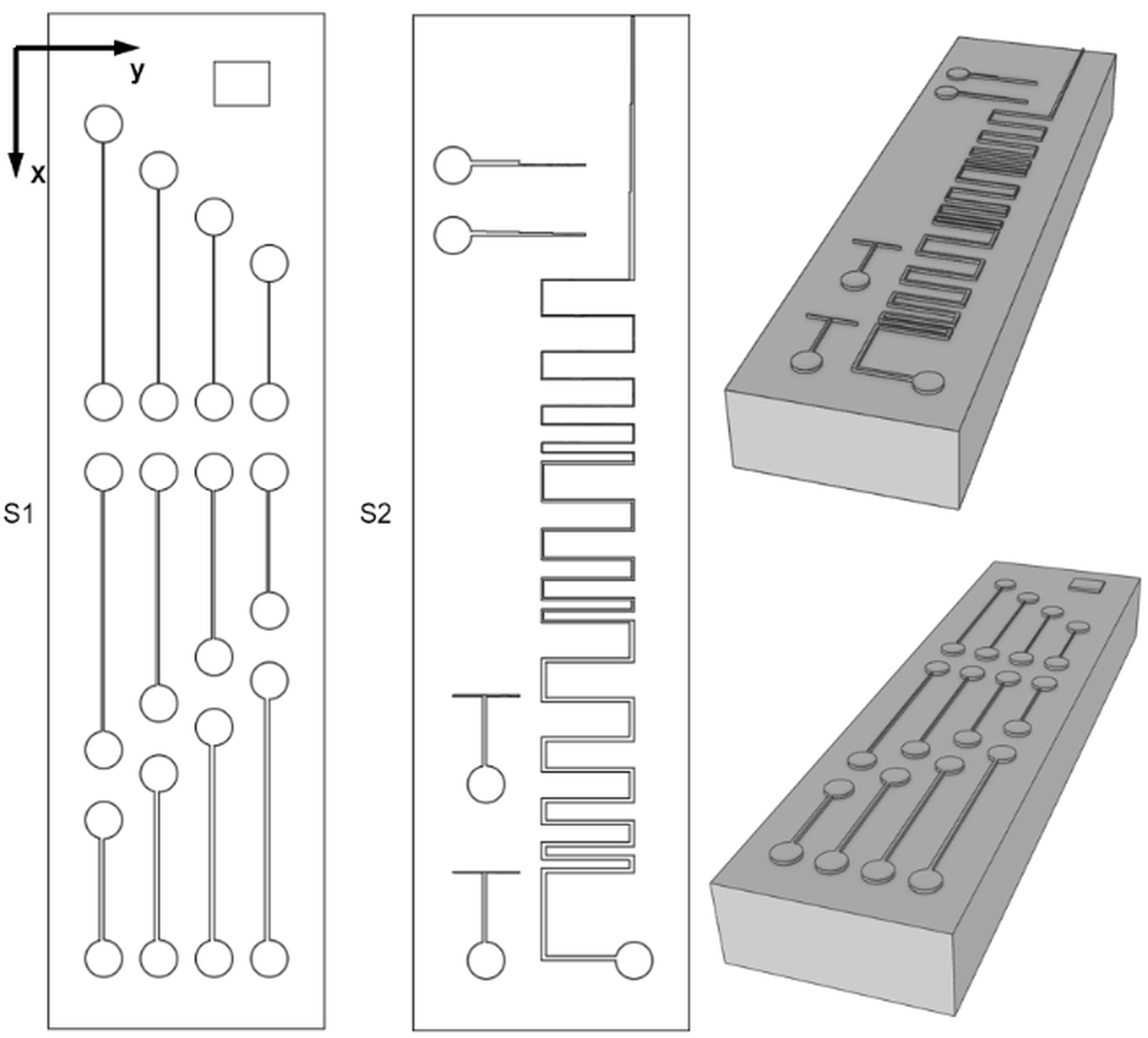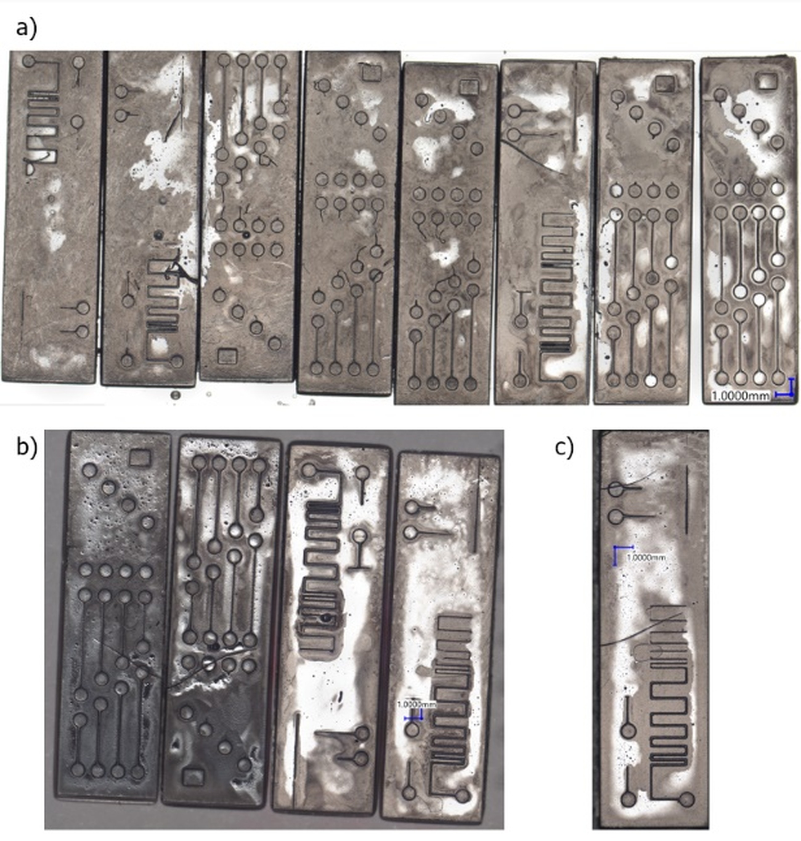 Zigzag pattern (Fig. 1. c) was designed to determine whether the length of horizontal parts of the channel influences the printability and dimensions of the sample. The pattern continues with decreasing channel cross-section (after the dash-dot (-.) line on the drawing), but with decreased channel cross-section. Features shown on d) were designed to examine the influence of decreasing channel cross dimension done in small and large decrements. Pattern e) is to determine the influence of the channel’s length. Those patterns were fitted on 2 different test samples, both of which are shown in Fig. 2 (named sample types S1 and S2 respectively).