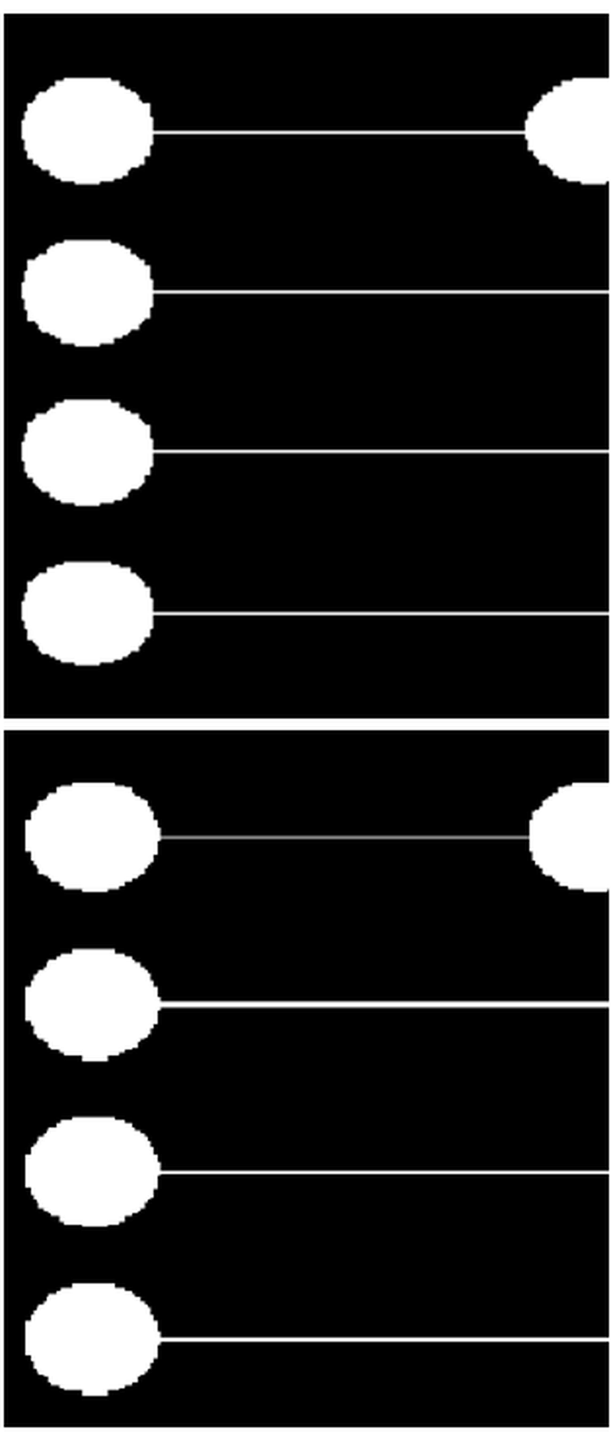 The 3D digital models of samples were created with Autodesk Inventor 2022 software and exported to stereolithography (.stl) file format. The overall dimensions of the sample’s supporting plate are 22.0x6.0x2.5 mm. By the authors’ experience, the thickness of 2.5 mm provides enough rigidity to prevent warping caused by shrinkage during the sample’s curing process. It is important to note, that due to the designed feature’s size, placement of each detail was calculated to fit the pixel mesh of the printer’s screen. With improper placement, the software that prepares input files for the printer will not reproduce the shapes properly. The software used to prepare beforementioned file was Anycubic Photon Workshop (APW). All of the programs prepared were inspected in APW. Fig. 3 shows part of the inspection screens, where the upper one maintains proper channel cross-dimensions, and the bottom one shows differences in light intensity (dimmed line) and channel thickness due to improper sample placement.