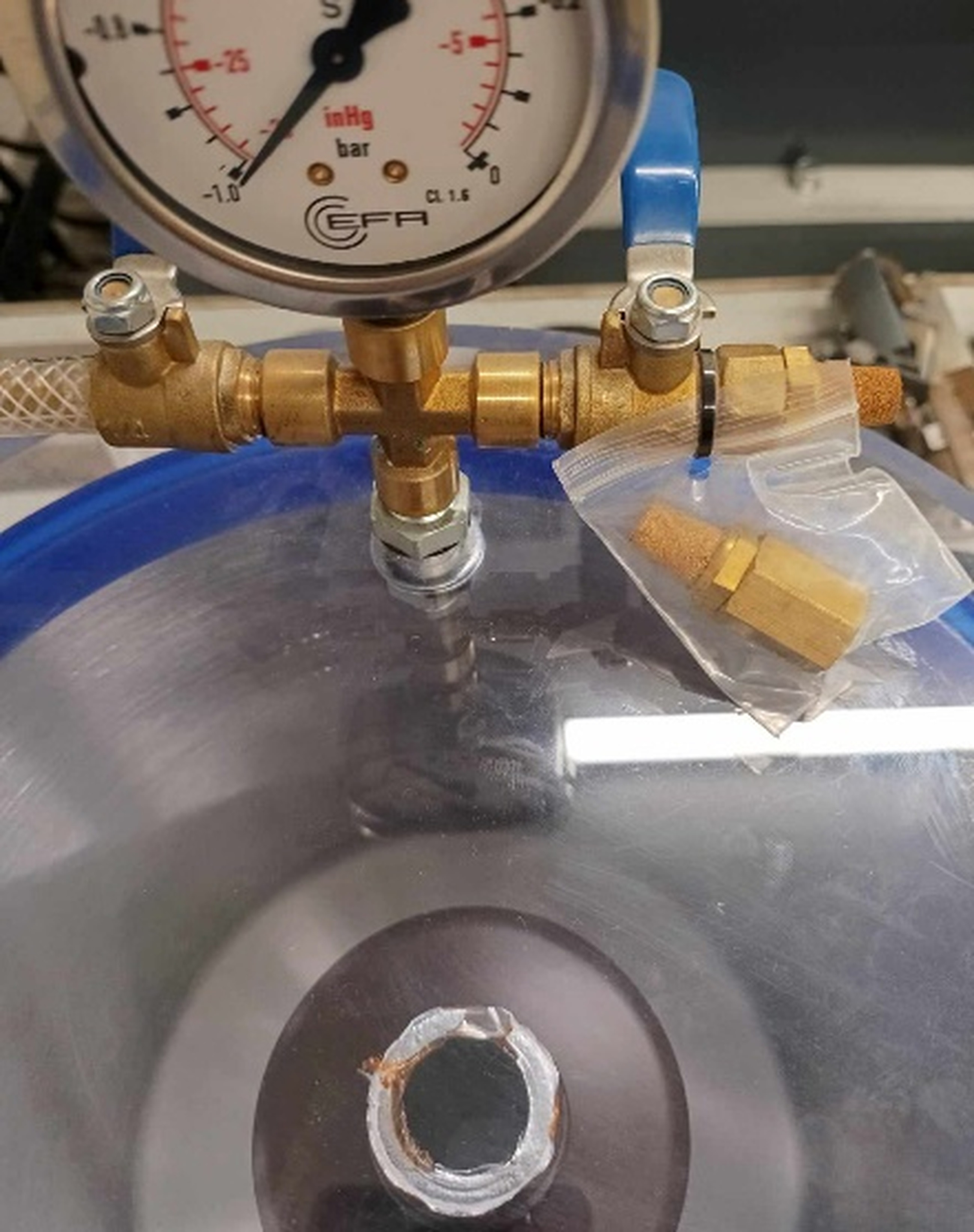 After that, the container was opened and unsealed, and placed in a vacuum chamber (VC2523A, vacuumchambers.eu, Bialystok, Poland) for degasification. The material was degasified until the negative pressure displayed on the chamber’s manometer reached -1 bar and no visible bubbles were present on the surface of the liquid pre-product (Fig. 4). Afterwards the prepared material was slowly poured into the machine’s resin vat to prevent mixing with air. The temperature of the resin was equalized with in-lab temperature (23 °C).