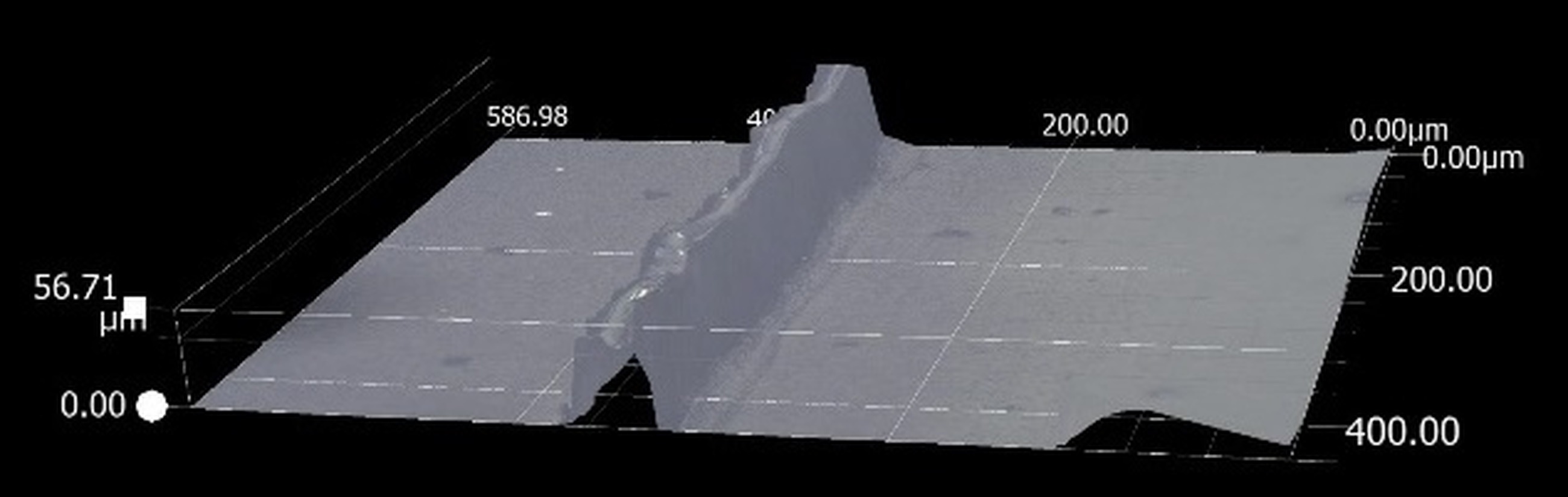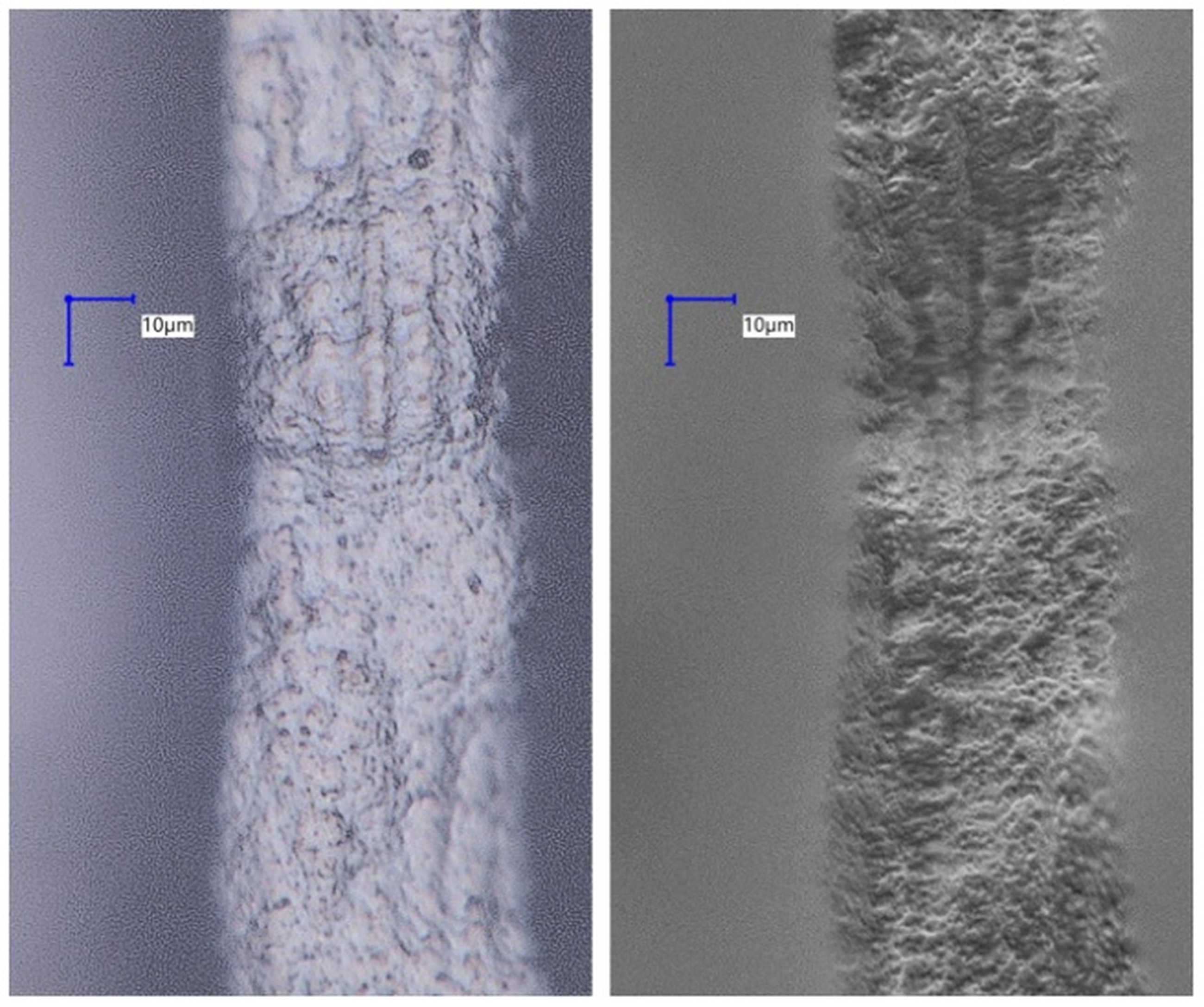 Another observation taken with high magnification lens was for examining the top surface of the protrusion. Figure 9 displays surface of the path from pattern p1e with model thickness of 48 µm. The measured thickness is 40 µm which coincides with observations from depth composition analysis (rounding and tapered surface are out of focus on this photograph). The surface is composed of small grains, with visible “stretch marks” colinear with the protrusion. The right side image also shows small oval dents, the largest being 4 µm in diameter. Small changes in the channel height are also visible on both depth composition and top surface images, not exceeding 10 µm, on the features that were successfully formed. Those changes could be caused by either shrinkage during the curing process or by micro-delamination when, during manufacturing, the layer is being separated from the ACF.