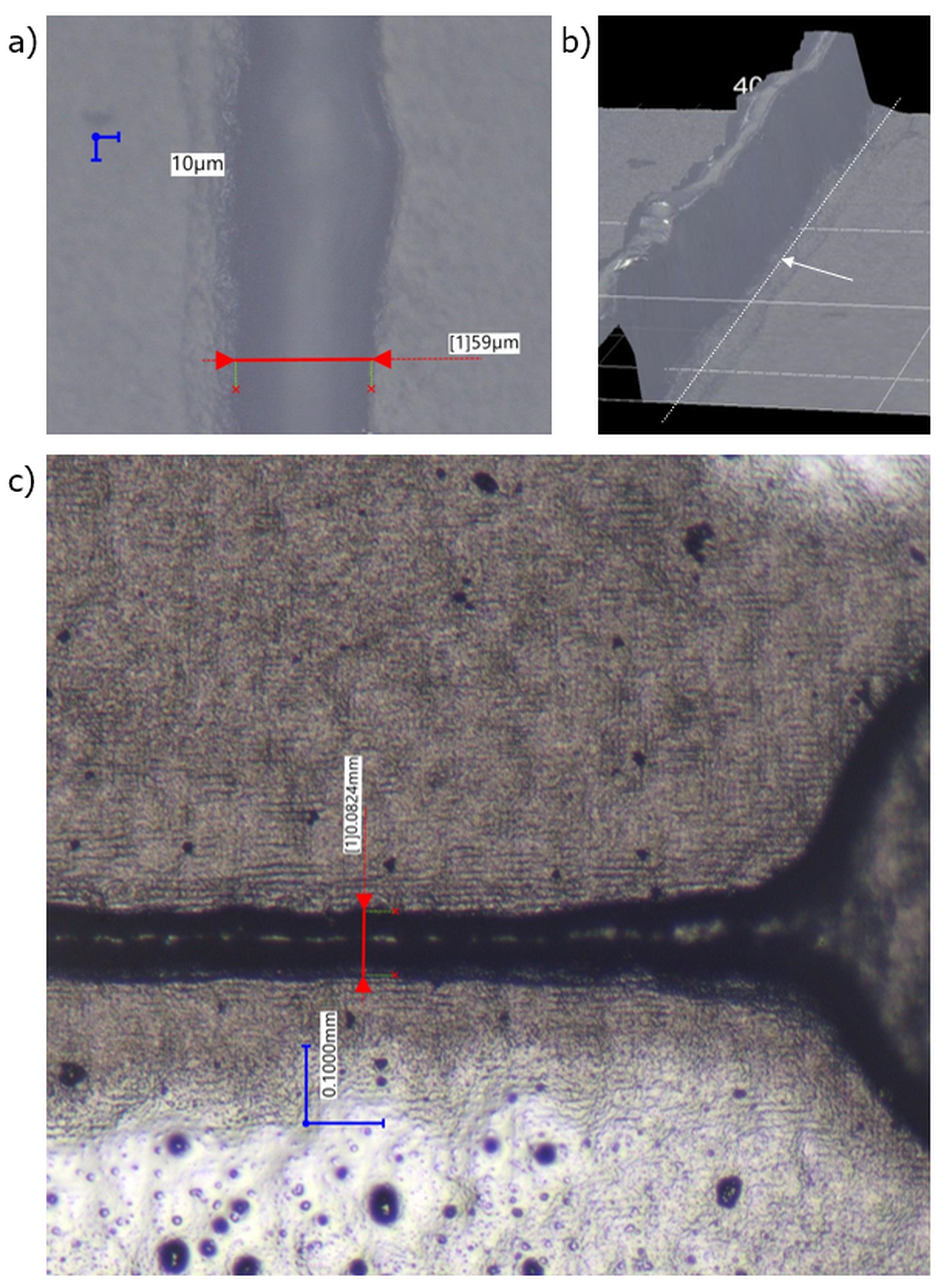 Fig. 8. Localization of performed depth composition; a) channel thickness with microscope lens focused on the lowest surface; b) Observed rounding at the foot of the channel, marked by the arrow; c) measurement in the same location (pattern p1 a) with default (central) illumination and magnification