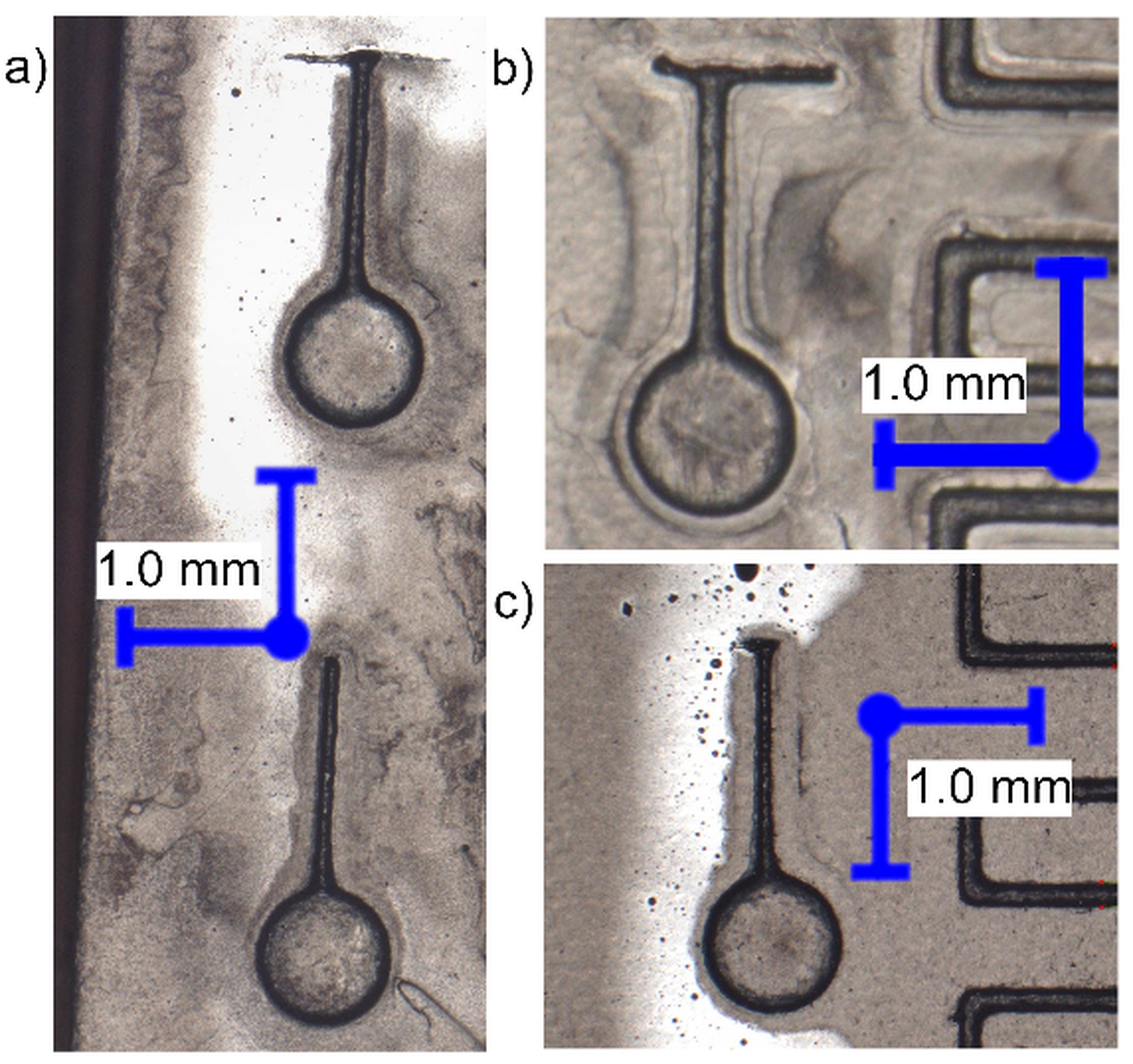 To complete the goals of this study, an LCD 3D printer was selected – Anycubic Photon Mono M5s (Shenzhen Anycubic Technology Co., Ltd., Shenzen, China) which offers an LCD screen with a resolution of 11520 per 5120 pixels. Additionally, the device utilizes ACF vat lining, for which adhesion forces are smaller than traditional FEP film. That, with the screen dimensions of 218 per 123 mm gives the single pixel size (theoretically the smallest printable feature) of approximately 19 per 24 µm. With that in mind, samples were designed to test the capabilities of manufacturing certain features desirable for molding MF devices. Several of the patterns selected are presented with important dimensions on Fig. 1. On each of the patterns presented here, the circular elements at the beginning of the channels have the same diameter of 0.8 mm and serve 2 purposes – to emulate the pump interface of MF device, and to anchor the delicate material forming the channel to the rest of the test sample during manufacturing process. Patterns a) and b) were designed to determine possibilities of forming 90° split patterns with decreasing channel cross-section.