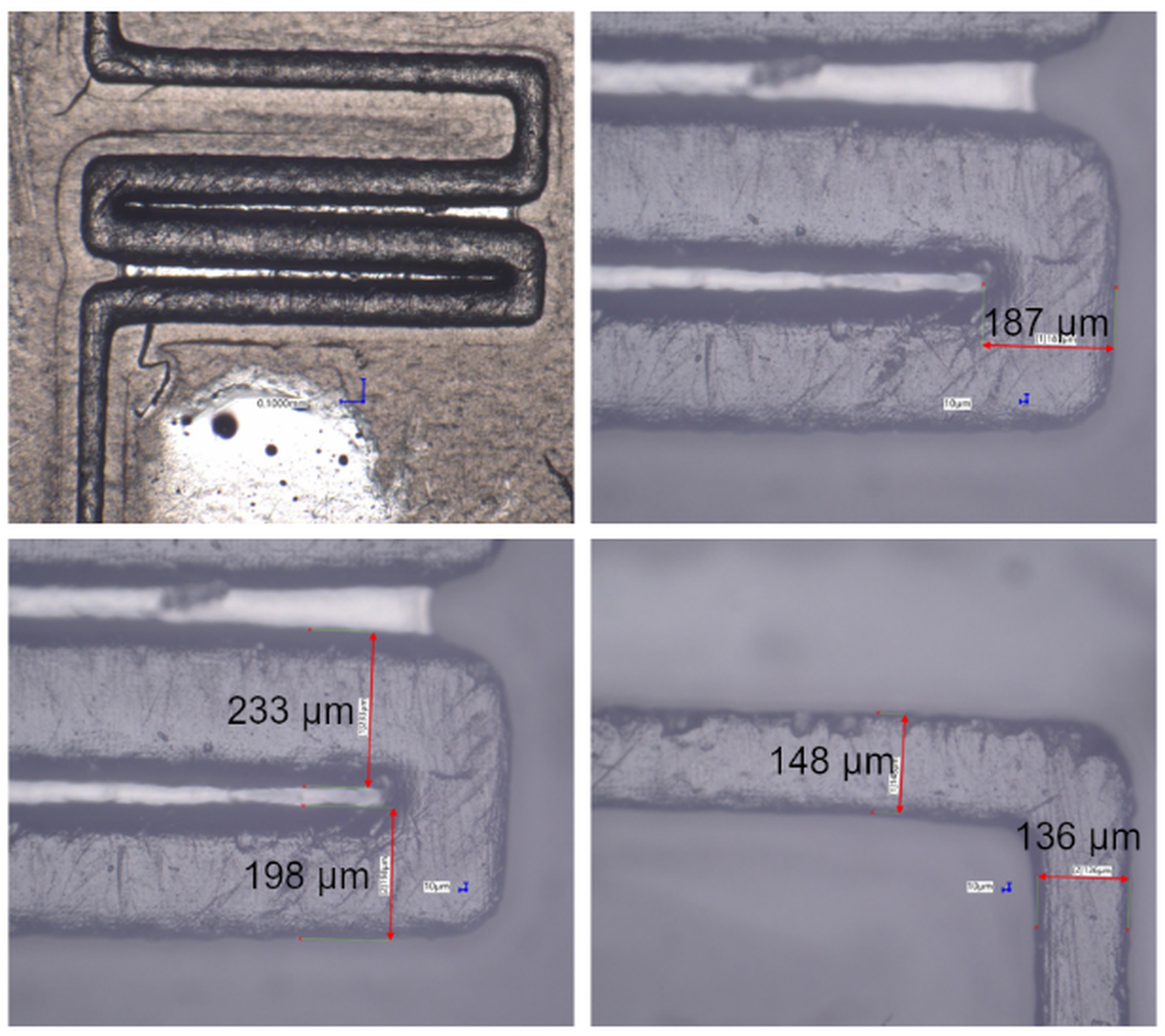 Shrinkage of the material does not play a role in the described manufacturing process, nevertheless it has to be accounted for in angled transitions, as the structures exhibit roundings on the edges.