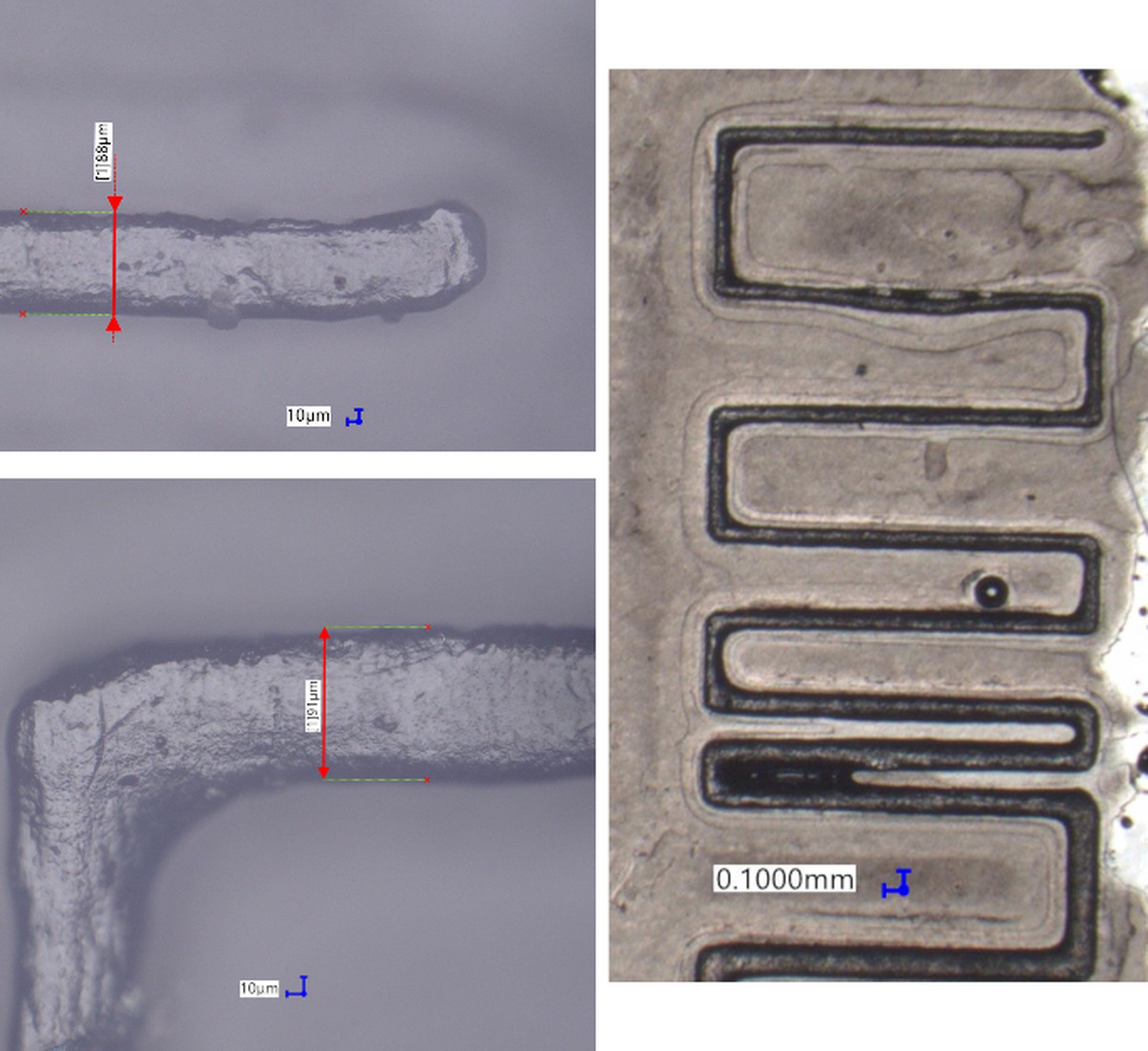 Features at the smallest possible scale (in the case of this study pixel size 19x24 µm), cannot be manufactured properly for larger channel lengths, but can be used for thinning thicker channels locally on a short distance (smaller than 200 µm).