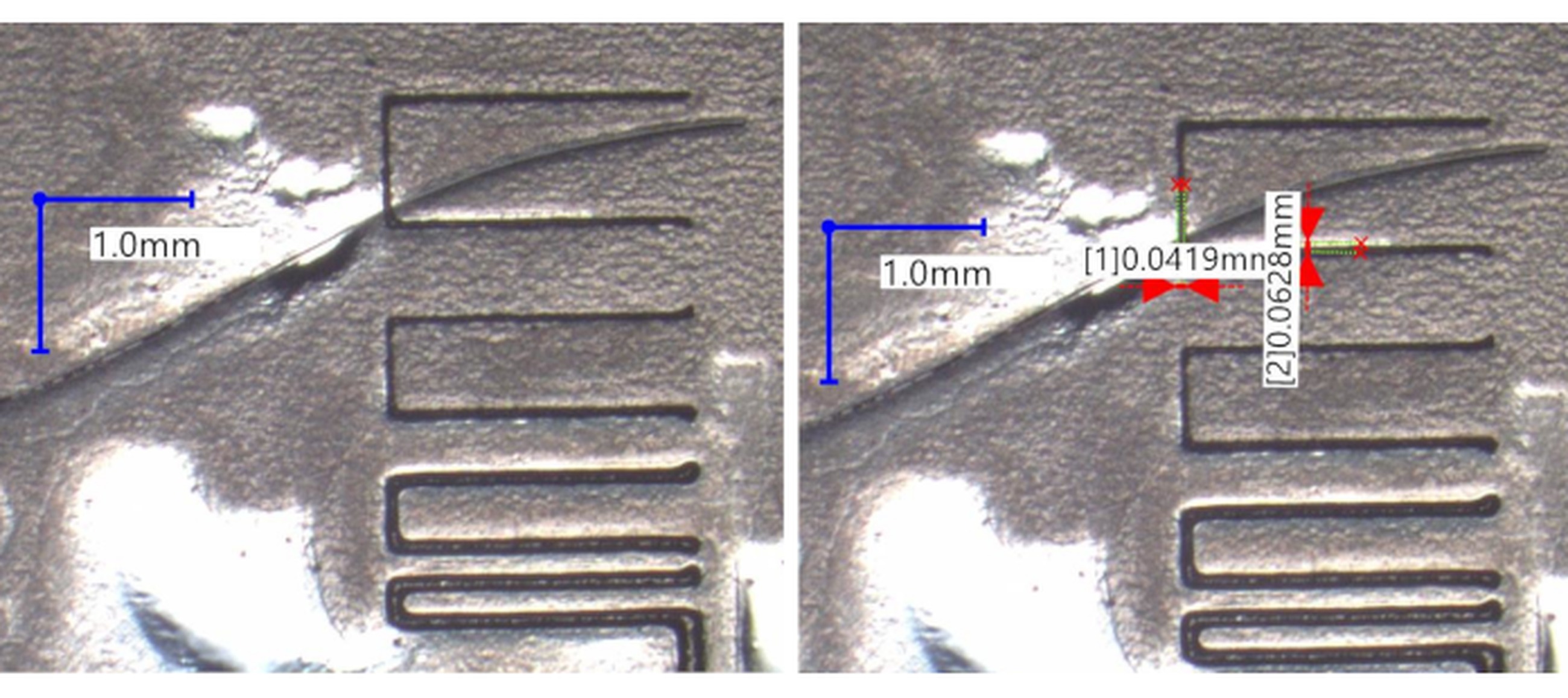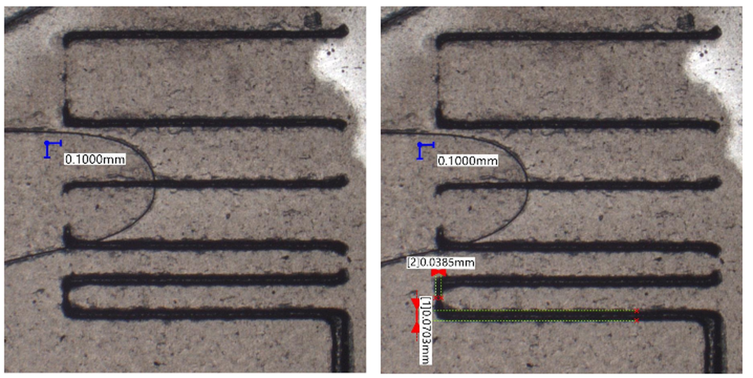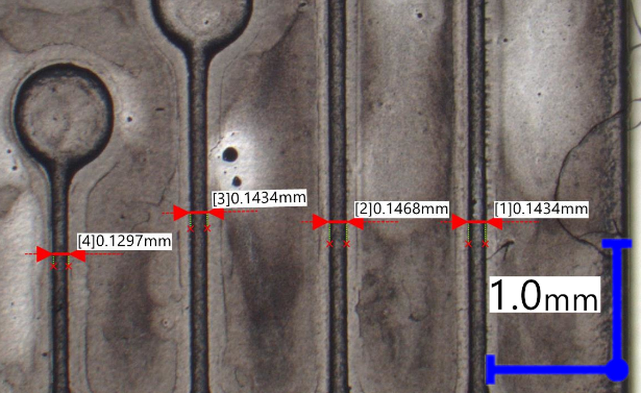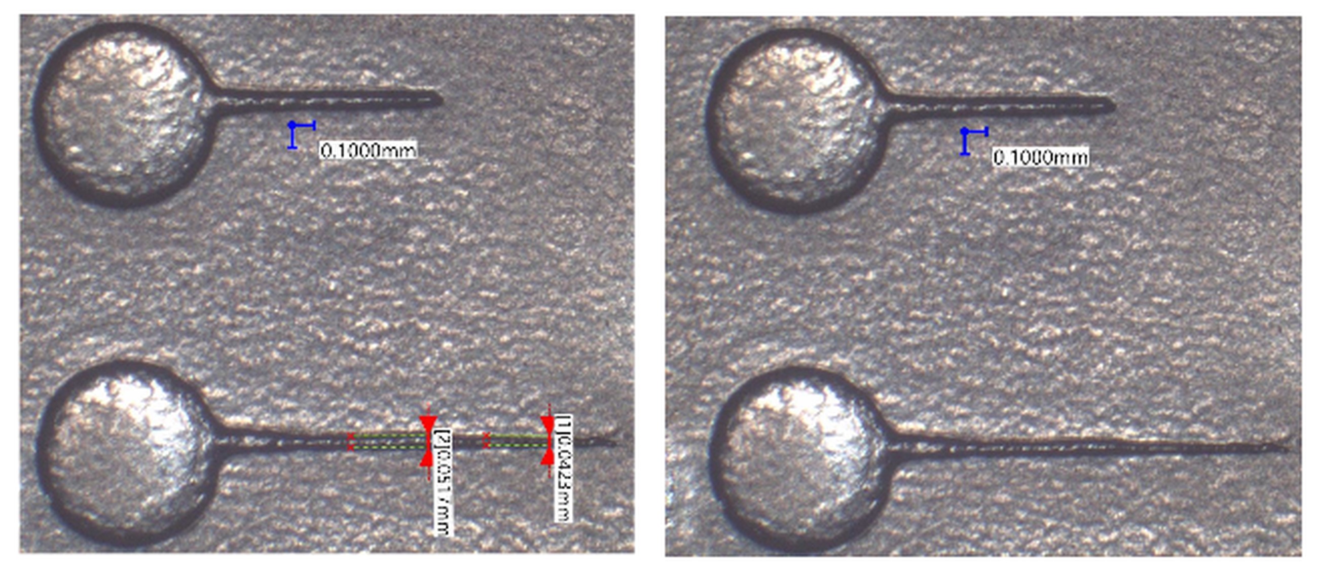 Calibration of the on screen measurement function of the microscope was checked by measuring dimension of a calibration sample with known dimensions. All of the observations with dimensions measurements were done with full central top light, if not stated otherwise in the text.