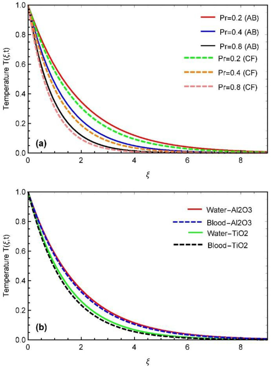 The impact of fractional parameters (α, β), on temperature is shown in Figs. 2(a, b). By raising the estimations of α, β, the temperature illustrates decaying behaviour (at a small time) and an increasing trend at a large time, consequently, we see that the fractional parameters have dual behaviour (for small and large time) for temperature. This specifies the consequence of the CF and AB fractional operators that promise to illustrate the generalized memory and hereditary features. This is due to the different properties of CF (based on exponential function having no singularity) and AB (having non-singular and non-local kernel) fractional operators. From Fig. 3a, as improvement in the estimations of Pr shows that development in the viscosity of liquid declines the difference among thermal boundary layers of the liquid, so the temperature profile declines because of the rises in the estimations of Pr and in the same way, the comparison of two nanofluids is shown in Fig. 3b by considering other parameters constant and changing the fractional parameters α, β. We see that the temperature of the blood-based NF is smaller than the water-based nanofluid, which is due to the physical characteristics of certain nanoparticles.