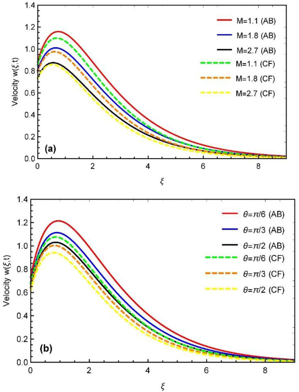 In the above section, the temperature, as well as velocity, is determined by using the AB-fractional derivative, now the modelling of governing equations by CF-fractional derivative may be expressed by replacing the ordinary derivative with CF-fractional derivative operative
