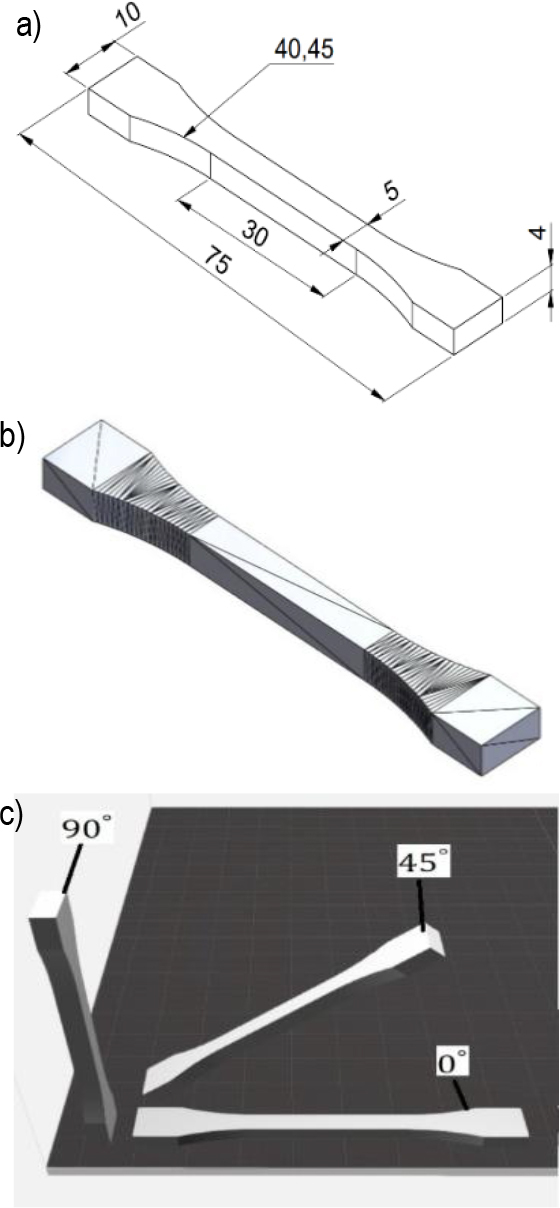 The test samples were designed in SolidWorks according to ISO 527. The shape of the samples are paddles with the dimensions in millimeters shown in Figure 2(a).