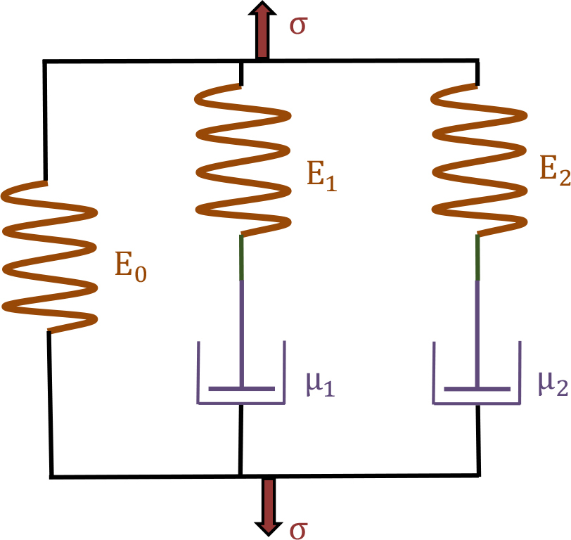 A complex five-parameter Maxwell-Wiechert model was used to describe the stress relaxation curves obtained from the stress relaxation tests. Approximations of this model to experimental curves were carried out with the OriginPro software using the Levenberg-Marquardt algorithm. The mechanical analogy of the Maxwell-Wiechert five-parameter model is shown in Figure 3 [5,13].