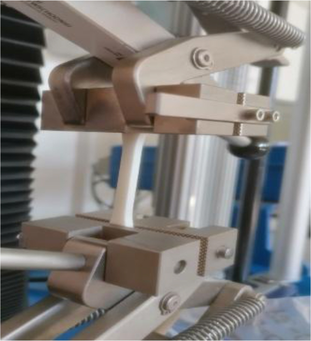 Stress relaxation tests were conducted using a Hegewald & Peschke Inspekt 3kN testing machine. The test parameters used to conduct the stress relaxation tests were: preload Fp = 100 N, speed of displacement of the machine crossbar to achieve the set strain vmm = 10 mm/s, permanent strain ε0 = 0.02, test duration t = 600 s. The test specimens were subjected to tensile stress, as can be seen in Figure 4.