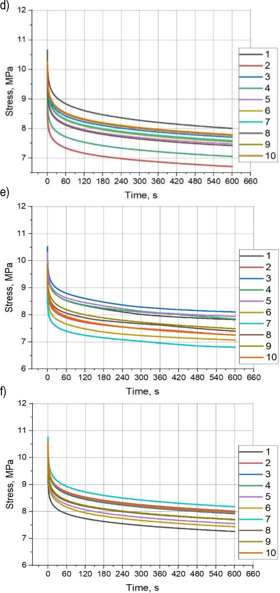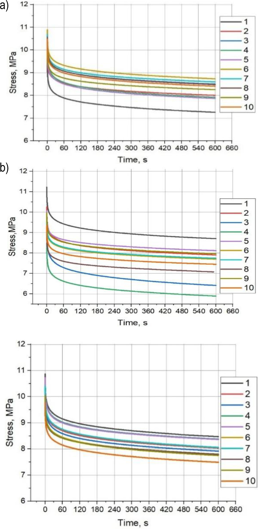 Stress relaxation tests were performed, resulting in stress relaxation curves. These curves are shown in Figures 5 and 6.