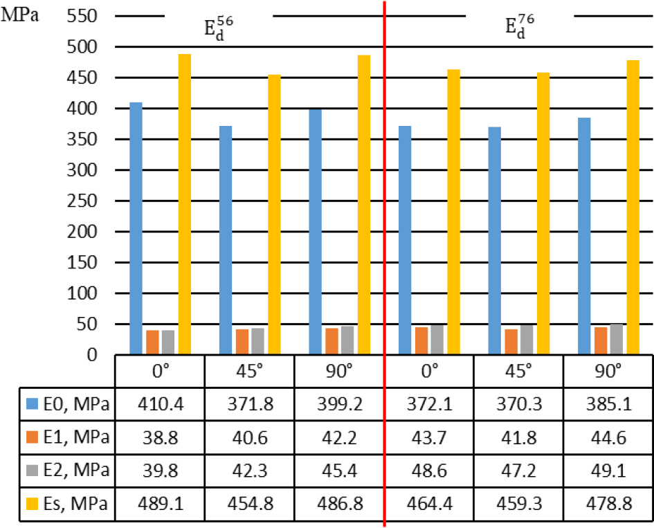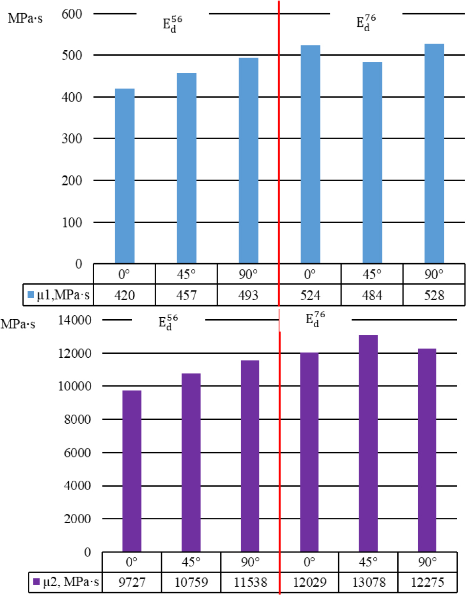 Analysing the different print orientations 0°, 45°, 90° for the equivalent moduli Es and dynamic viscosity coefficients μ1, μ2 shown in Figures 8 and 9, it can be seen that there is a difference in values between the applied energy densities Ed = 0.056 J/mm2 and Ed = 0.076 J/mm2. The equivalent moduli of Es for print orientations 0°, 90° and energy density