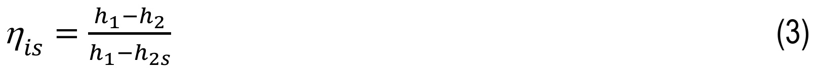The isentropic efficiency of the microturbine was calculated using the following relationship:
