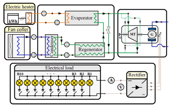 The research procedure is shown in Fig. 3. In the first stage of the work, the heat source power was set, and the thermal oil cycle was started. The required working medium flow rate was then preset, and both the working medium cycle and the cooling system (condenser heat removal system) were activated. During the heating and evaporation process, the working medium was directed through a bypass to the microturbine. The cooling system for the microturbogenerator’s generator was then started. Before start-up, the generator was connected to a load with a total rated power of 2,000 W for all electrical receivers (bulbs) (Fig. 3). Once stable operation of the ORC system had been achieved at a constant heat source power and flow rate, the HFE-7100 medium was directed to the bearing system (with the valves supplying the microturbine blade system closed), and the microturbine casing was heated.