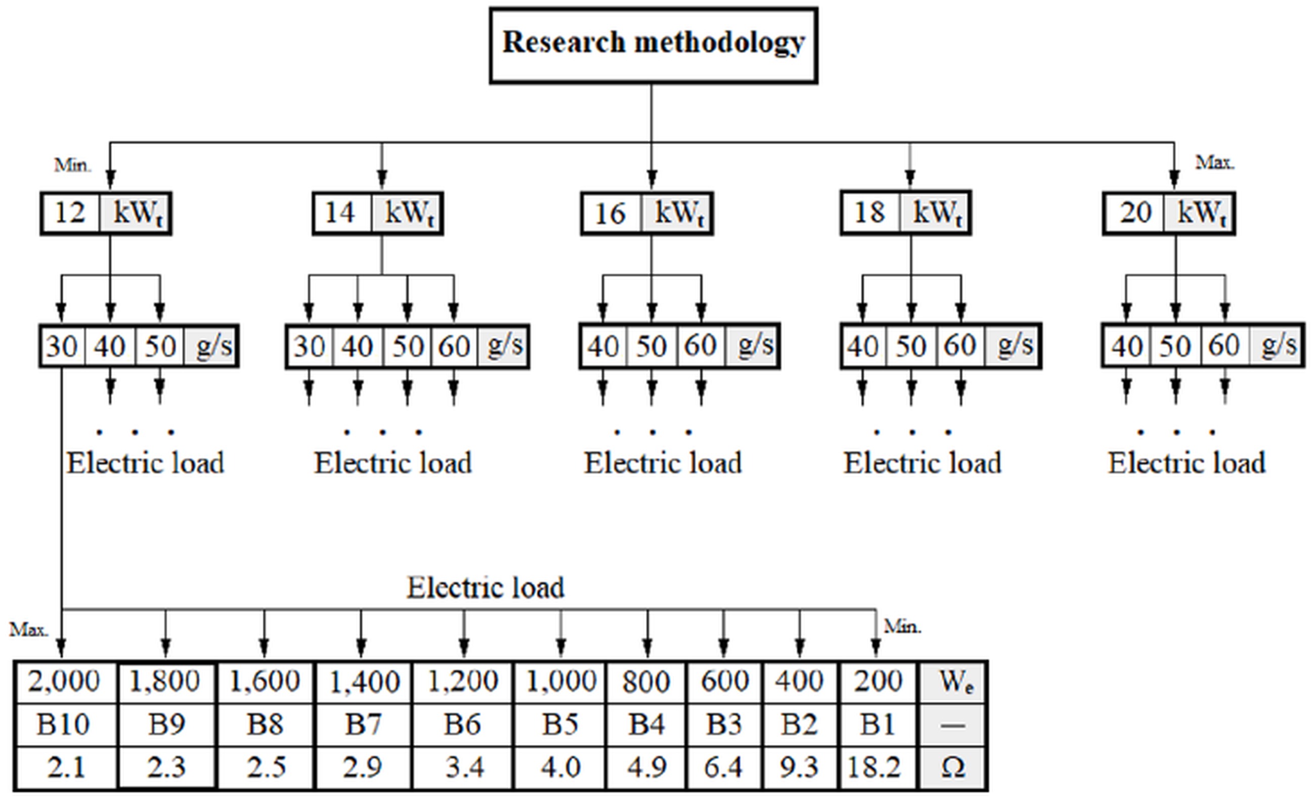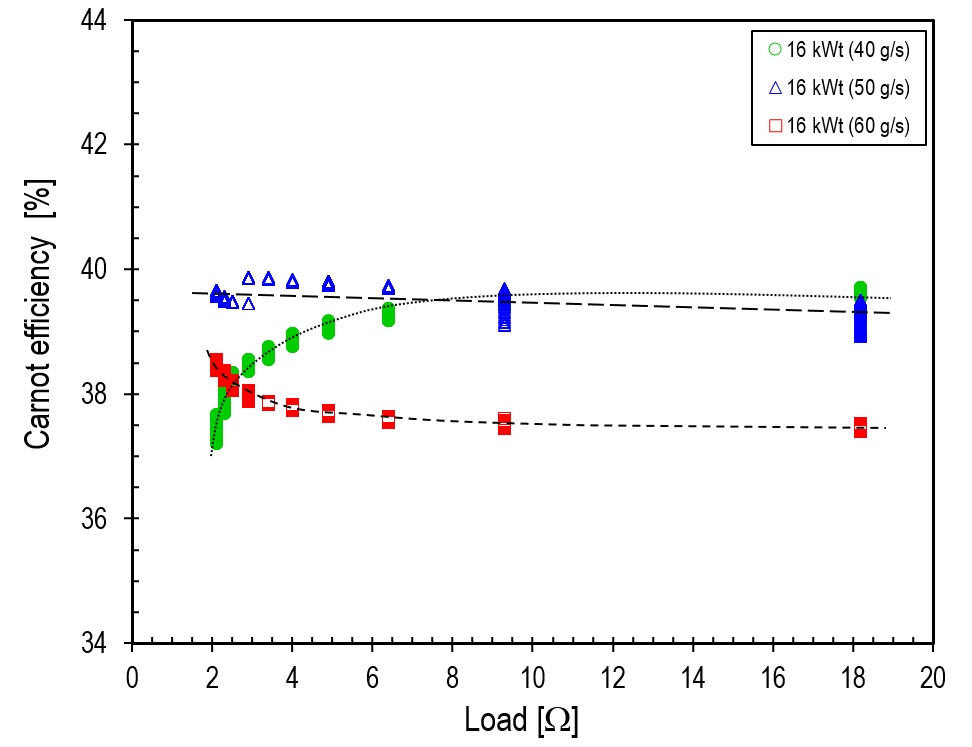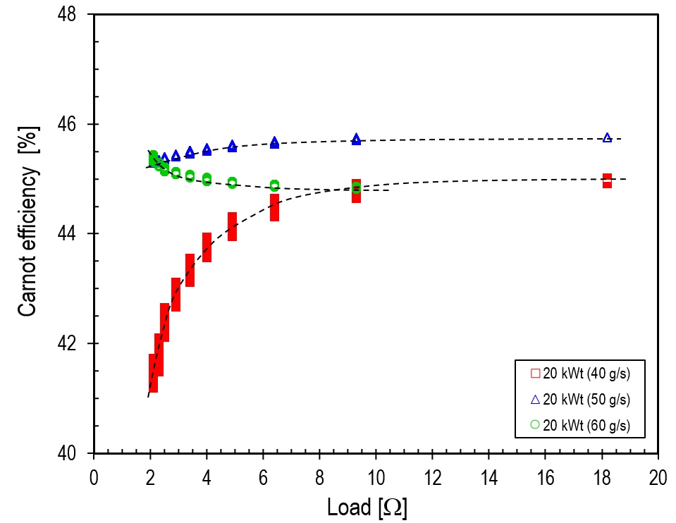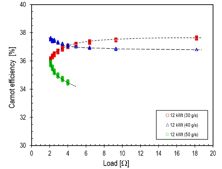 Thirdly, it was determined that the optimum load range for the microturbine generator, for a flow rate between 30 and 60 g/s and a heat source power between 12 and 20 kWt, at which the Carnot efficiency was maximised, was from 2.1 Ω to 9.3 Ω.