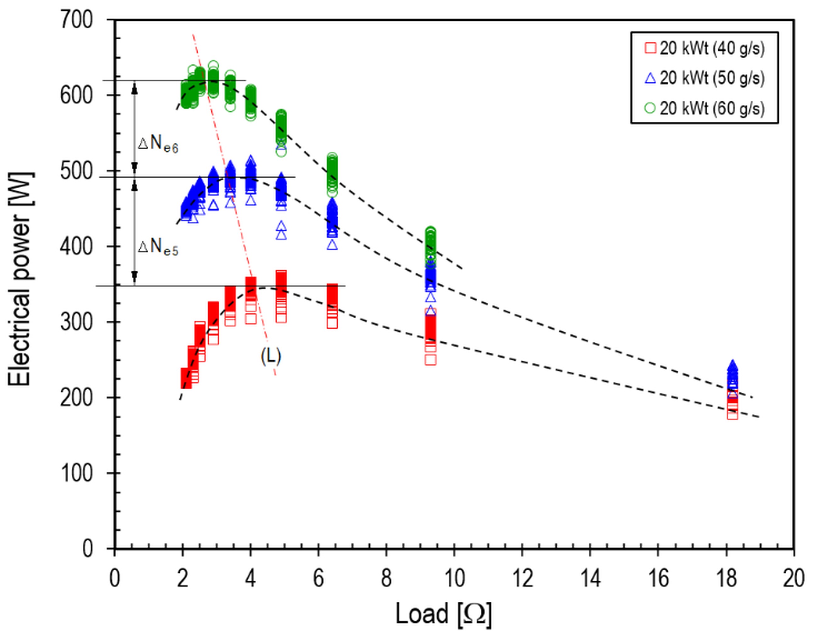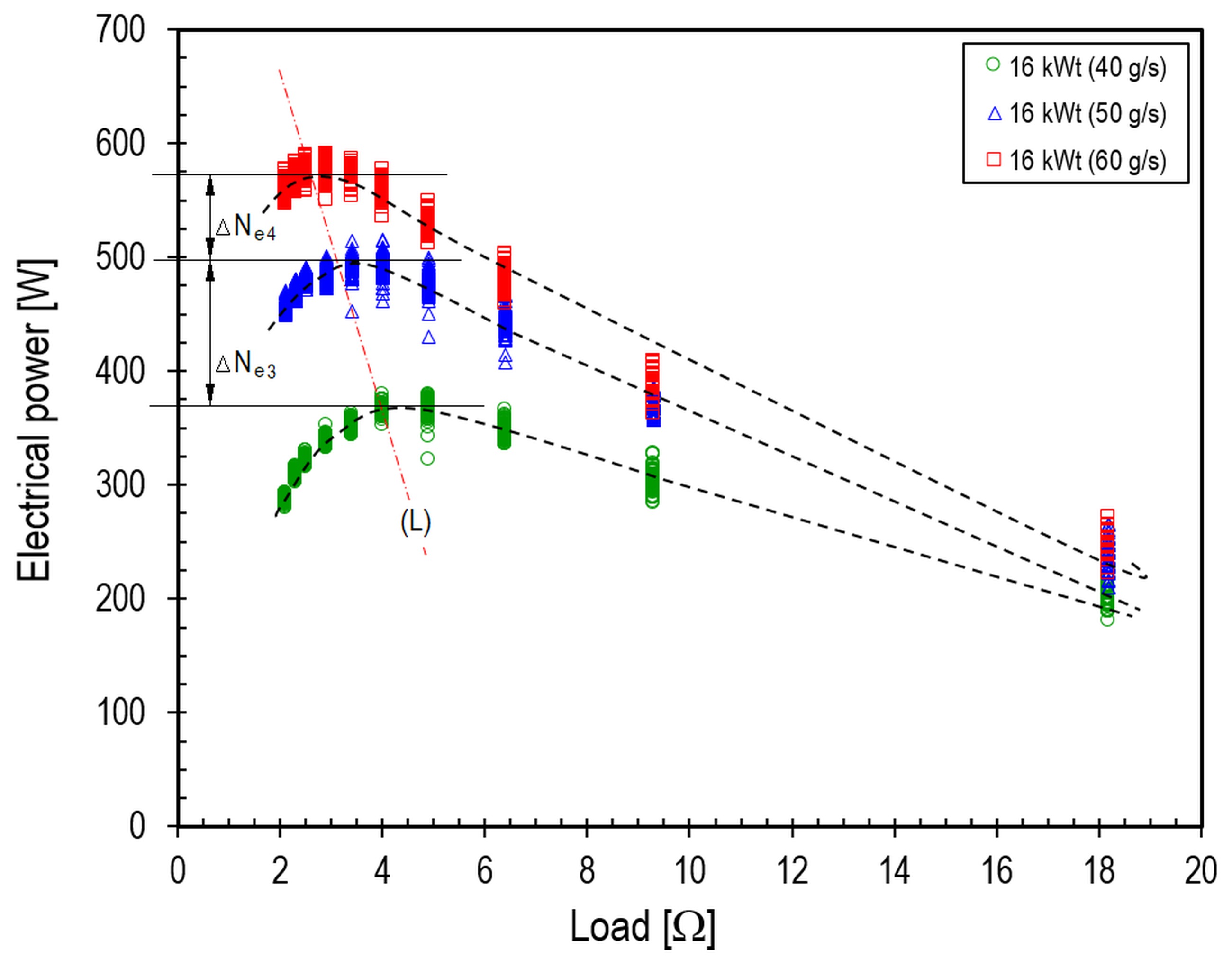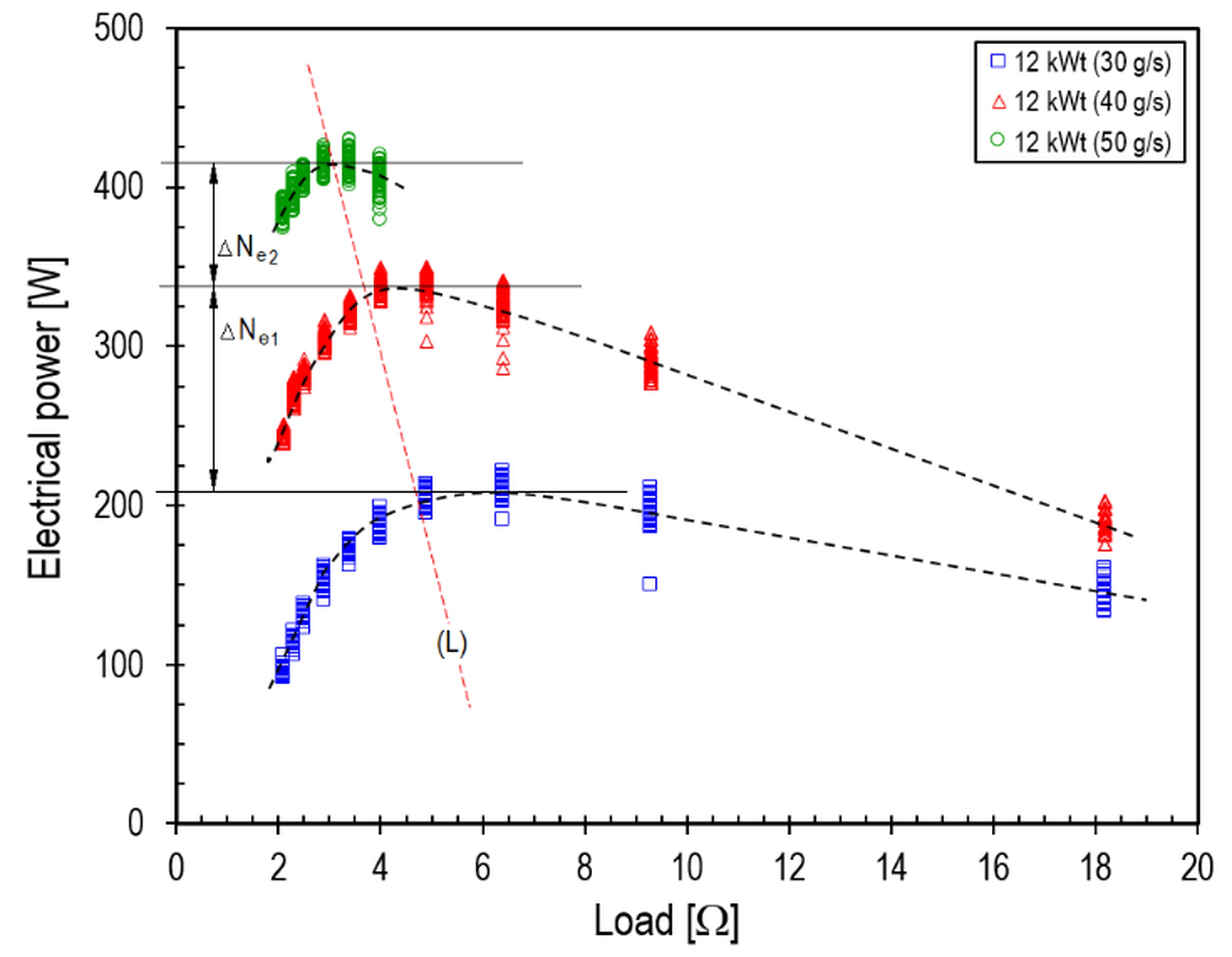 Fig. 4. Effect of generator load on the electrical power of the ORC system at a heat source power of 12 kWt: L – line of optimal load