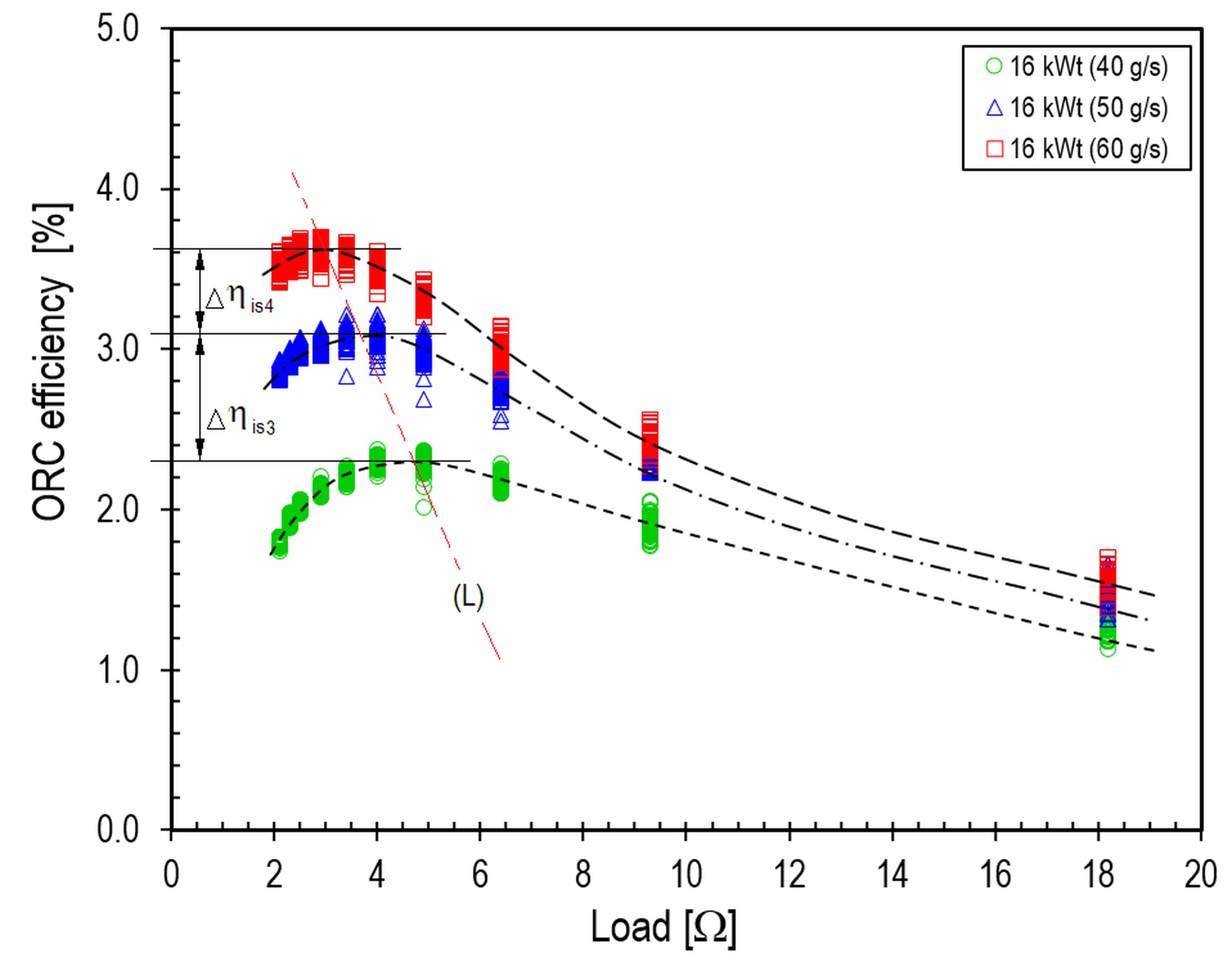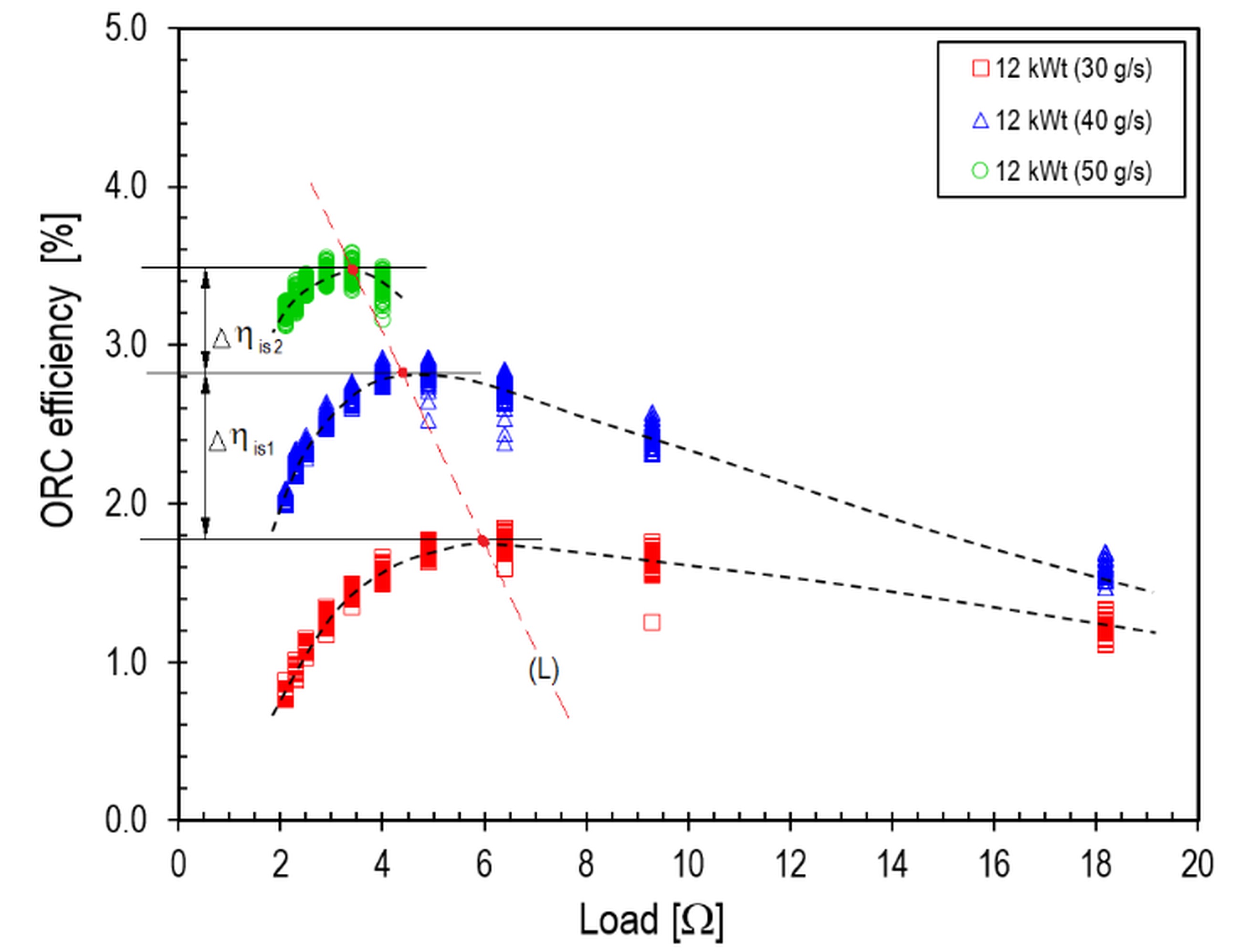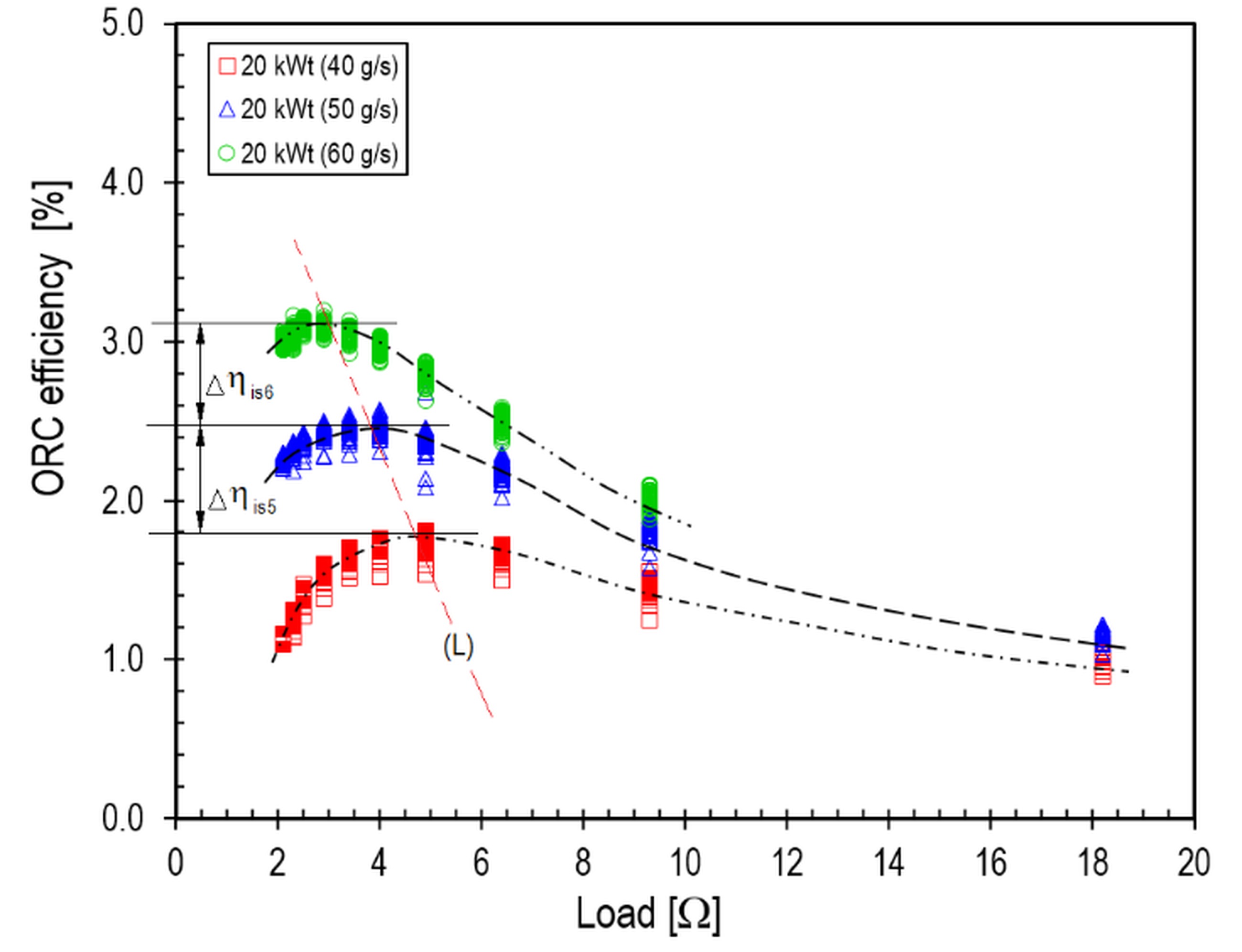Example characteristics illustrating the effect of generator load on the ORC system efficiency for heat source powers of 12 kWt, 16 kWt, and 20 kWt are shown in Figs. 13–15, respectively. It was determined that, irrespective of the heat source power, the efficiency of the ORC system increased as the flow rate of the working medium increased. It was found that, for a preset heat source power and maximum ORC system efficiencies, the optimum load resistance decreased as the HFE-7100 medium flow rate increased, with the load line (L) sloping to the left.