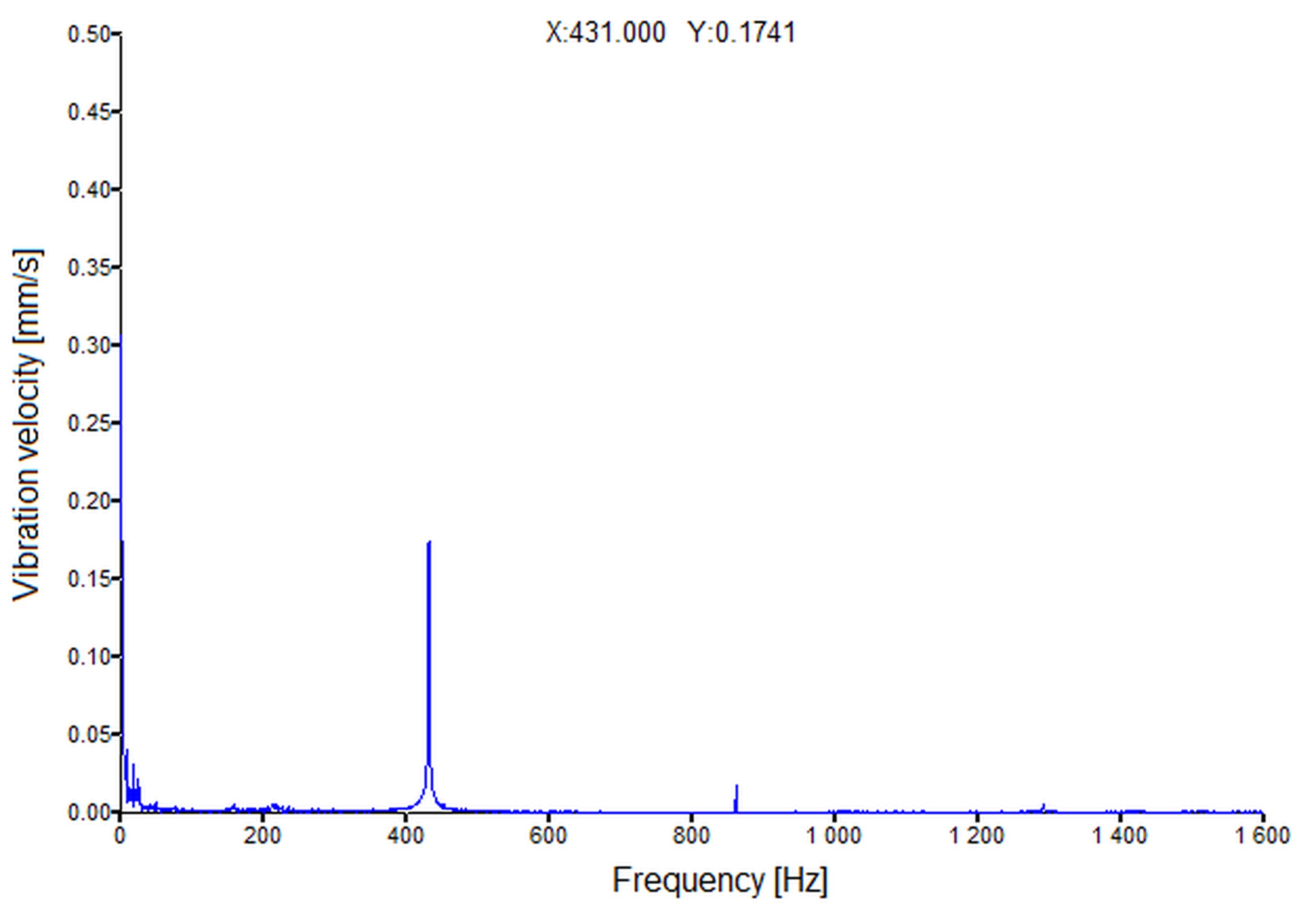 Fig. 17. Vibration velocity spectrum recorded on the microturbine casing in the vertical direction at a rotational speed of 25,860 rpm