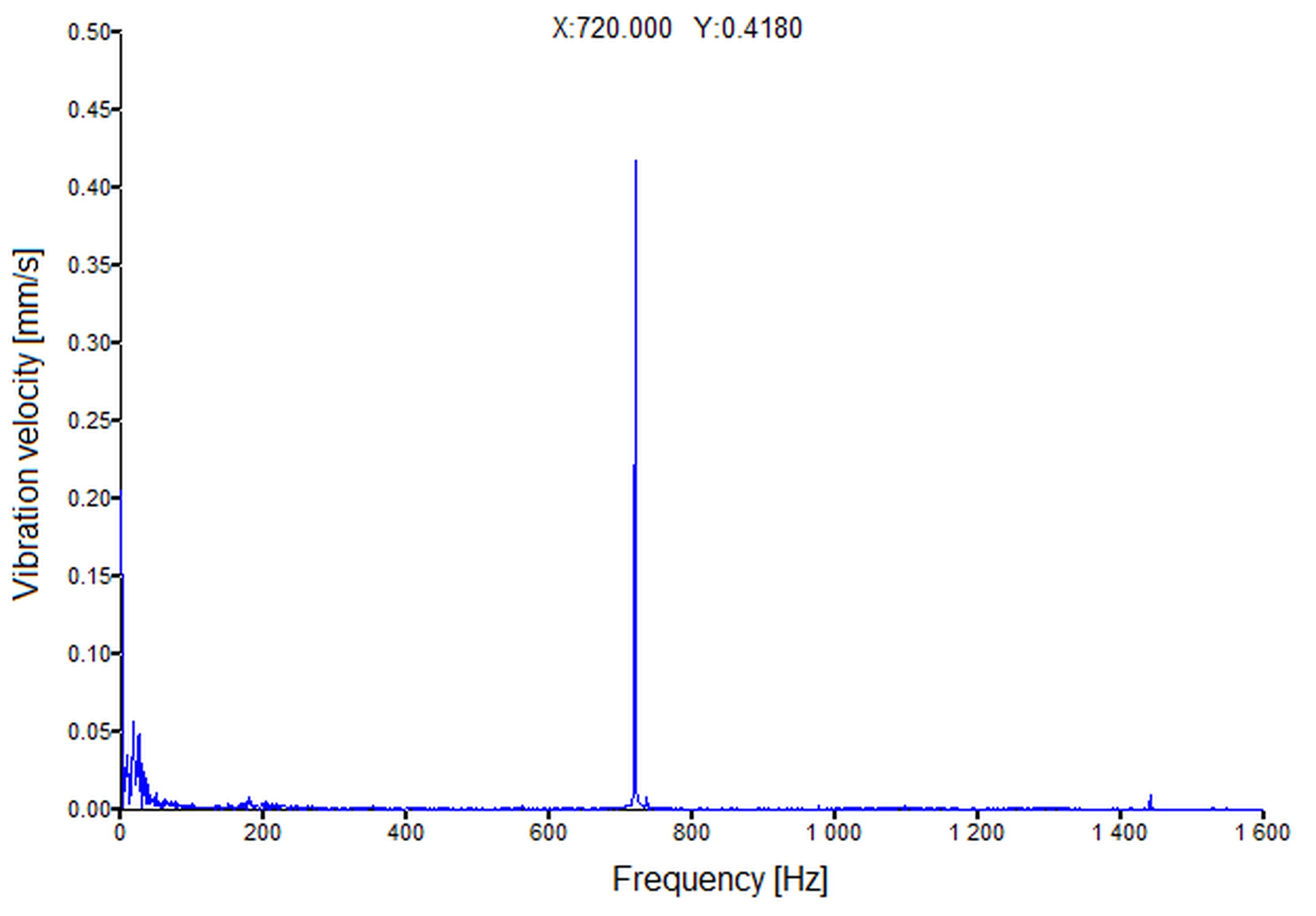 Fig. 18. Vibration velocity spectrum recorded on the microturbine casing in the vertical direction at a rotational speed of 43,200 rpm