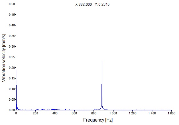 Fig. 19. Vibration velocity spectrum recorded on the microturbine casing in the vertical direction at a rotational speed of 52,920 rpm