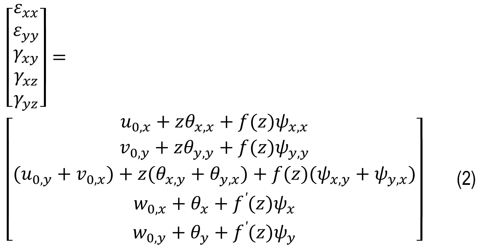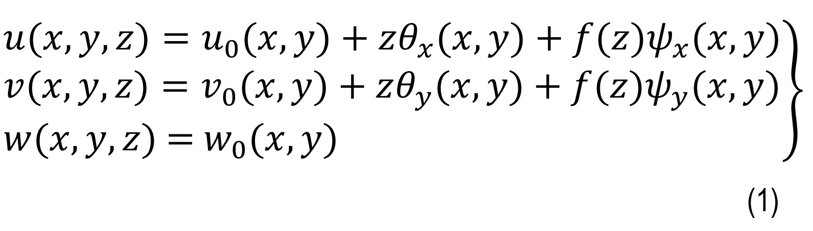 where, u0,x=(∂u0)/(∂x),f'(z)=(df)/(dz). These include contributions from both rotation and non-polynomial shear deformation. Also εx&εyae normal stress in x & y direction, γxy,γxz&γyzbeling shear strain in xy,xz & yz planes correspondingly.
