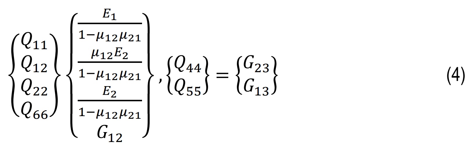 E1,E2are the Young’s moduli along the fiber and transverse directions, G12,G13,G23, the shear moduli, and μ12,μ21 the Poisson’s ratios (μ12)/(E1)=((μ21)/(E2)) these four independent properties define the lamina’s stress–strain behavior under in-plane loading.