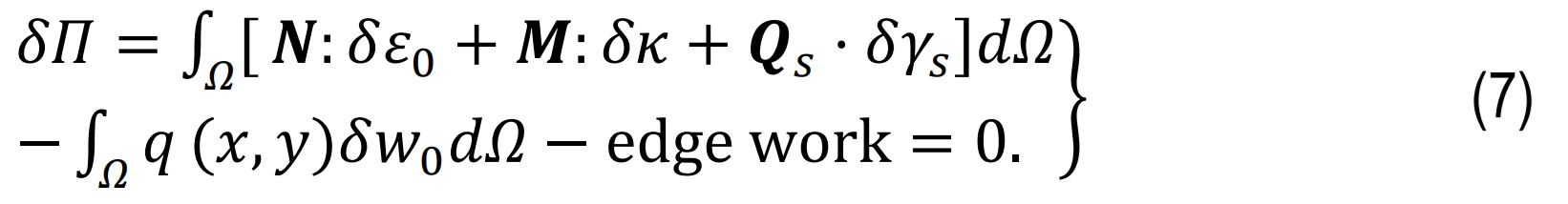 where Dm contains in-plane A, bending D, and coupling B contributions placed in generalized stiffness. The thickness integrals are evaluated to get A,B,D and then used them to assemble the planar constitutive matrix for BmTDmBm.And Ds is the shear constitutive kernel and depends on integrals of G(z) with f'(z) and unity factors.