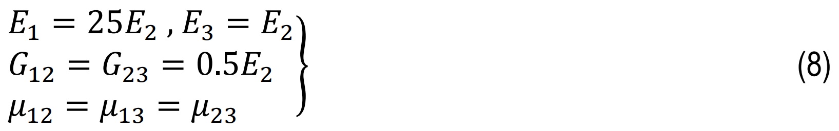 where E1,E2&E3 are Young’s moduli in principal directions. G12,G13 being shear moduli and μ12,μ13&μ23 are Poisson’s ratios.