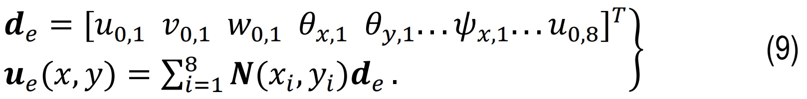 The membrane/bending B matrix Bm maps element nodal displacement vector, de:{εxx,εyy,γxy}T and curvature part included through derivatives of θ while shear B matrix Bs: maps de:{γxz,γyz}T. In this N (x,y) are shape functions of the finite element and u(x,y) being displacement vector at any point in the element.