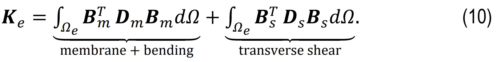 Element stiffness comprises membrane/bending and shear parts and shown in Eq. 10.
