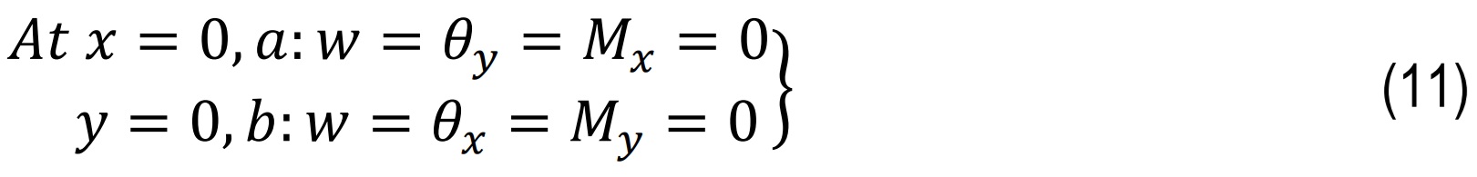 The plate is subjected to simply supported boundary conditions (SSBCs) along all edges, with displacement constraints applied directly, while finite element model naturally satisfies the corresponding bending moment conditions, as shown in Eq. 11.