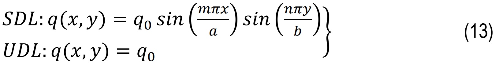 For SDL, the loading typically follows a sinusoidal pattern in both x & y directions, while UDL represents a constant load over the plate surface shown in Eq.13. The first-mode loading condition is considered by taking m=n=1.