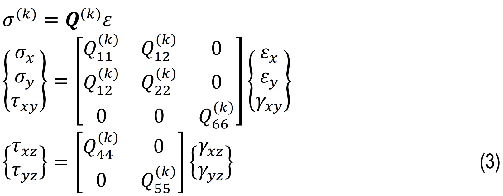 Each orthotropic layer of the plate has known elastic constants. The stress–strain relation for a given layer, with one axis of orthotropy aligned with a principal axis, is expressed in Eq.3 [27] and used in the FE formulation.