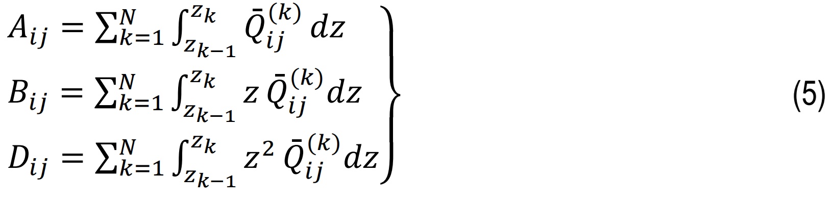 where Ai,Bi&Diare extensional stiffness, bending–extensional coupling stiffness, and bending stiffness correspondingly.
