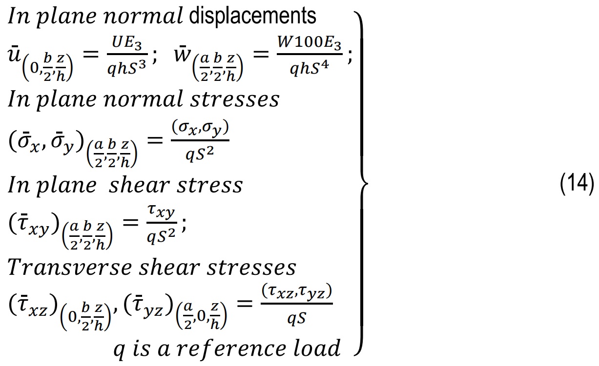 After solving the finite element system, ply-level stresses are extracted through the thickness. Global strains are first computed from the plate kinematics and then transformed into the local material axes for each ply k. Local stresses are obtained using the constitutive relations. To facilitate comparison across different laminates and geometries, stresses and moments are non-dimensionalized as shown in Eq.14. [27]