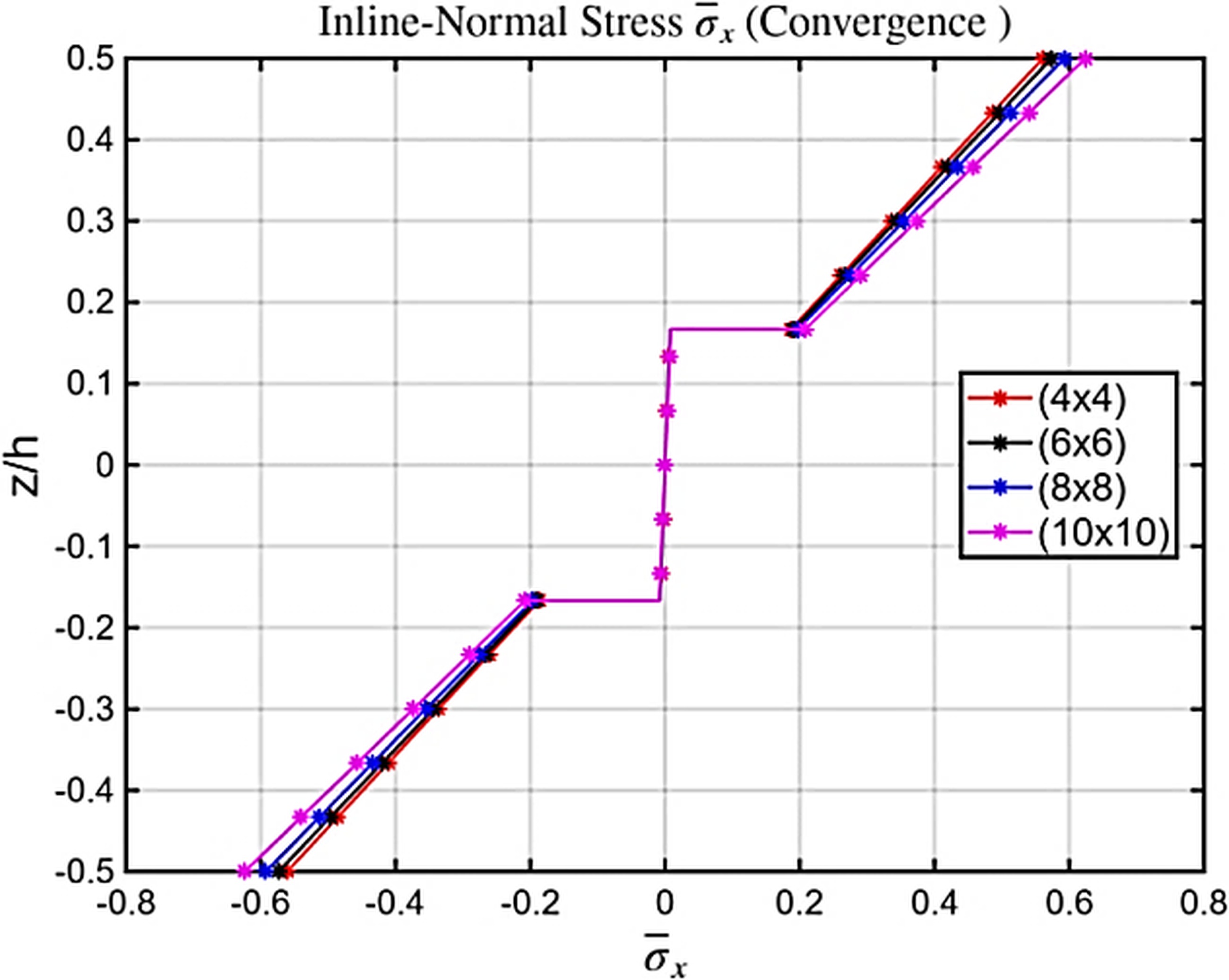 The convergence trend is further supported by the variation of in-plane normal stresses through the thickness for different mesh sizes. Coarser meshes (4×4&6×6) exhibit noticeable deviations, particularly near the outer surfaces where stress gradients are strongest. In contrast, the results from the (8×8&10×10) meshes are nearly indistinguishable, confirming that additional refinement produces negligible changes. This behavior demonstrates that the formulation is free from shear locking and that the inverse-cotangent shear function ensures a smooth, physically realistic thickness-wise stress distribution. The presence of higher-order in-plane terms contributes to stable and accurate stress recovery throughout the laminate. Collectively, these observations establish the numerical robustness and efficiency of the developed finite element model.