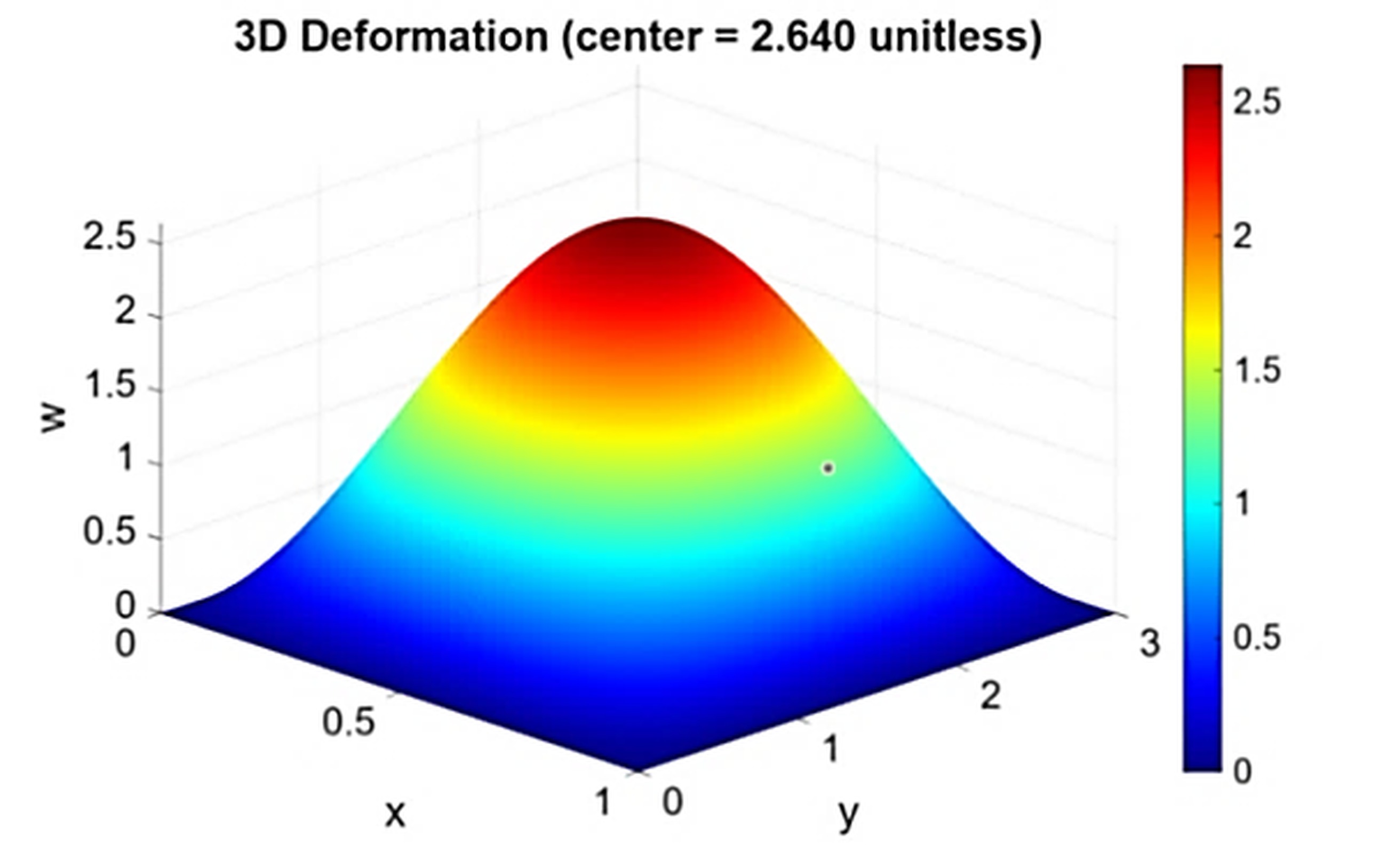 The deformation profile for the same loading case confirms the correct representation of bending behavior. The response remains symmetric, showing a maximum deflection at the plate center consistent with simply supported boundary conditions. The curvature distribution is smooth, and no artificial stiffness is observed, reflecting the capability of the higher-order displacement field to accurately capture both bending and shear effects. For S=4, the non-dimensional mid-plane deflection obtained from the model aligns closely with reference three-dimensional elasticity solutions (w=2.64), indicating a correct global response even for thick plates. The absence of edge irregularities further verifies that the inverse-cotangent function inherently satisfies traction-free shear conditions. Overall, the deformation plots demonstrate that the proposed model accurately represents the bending characteristics of plates subjected SDL.