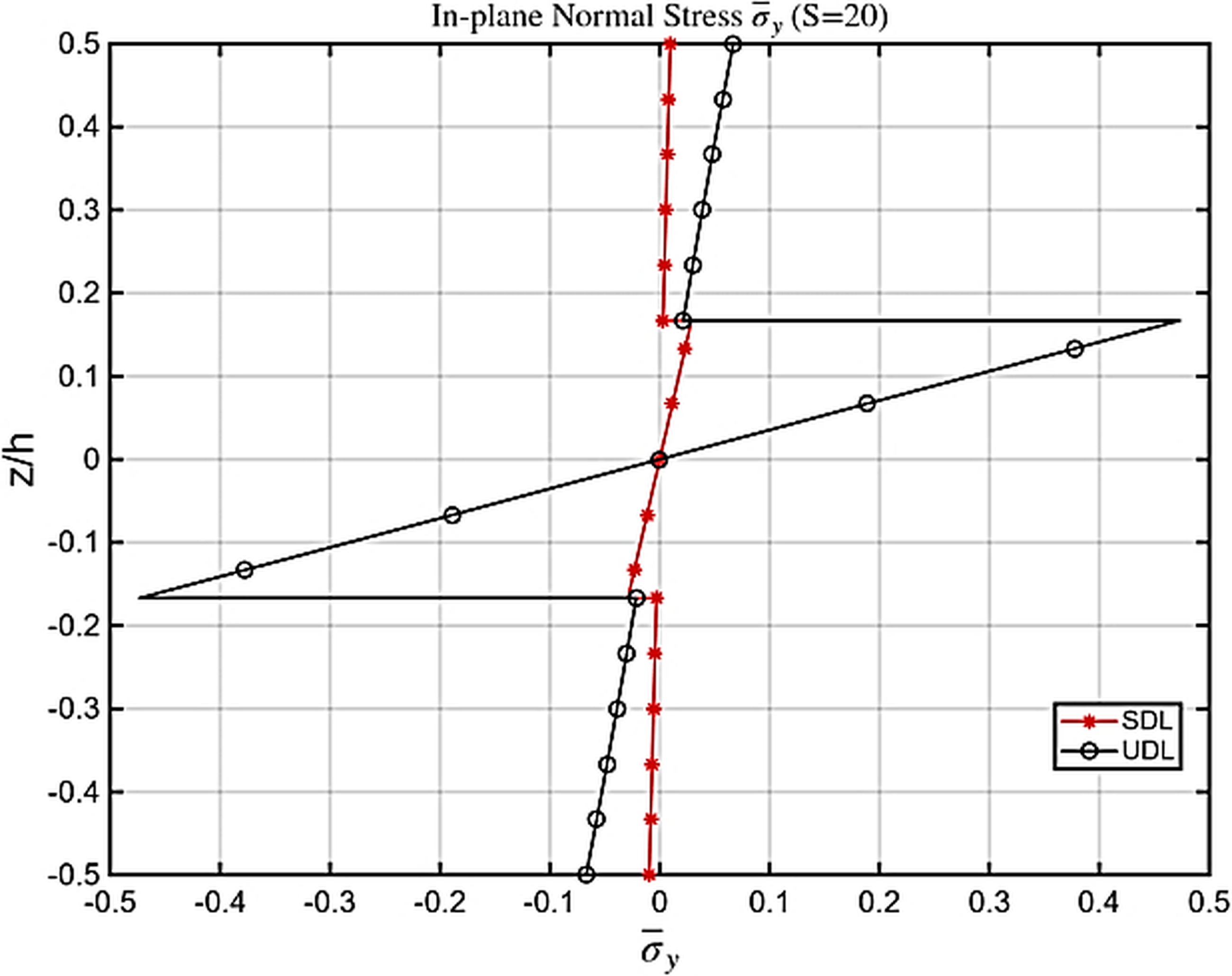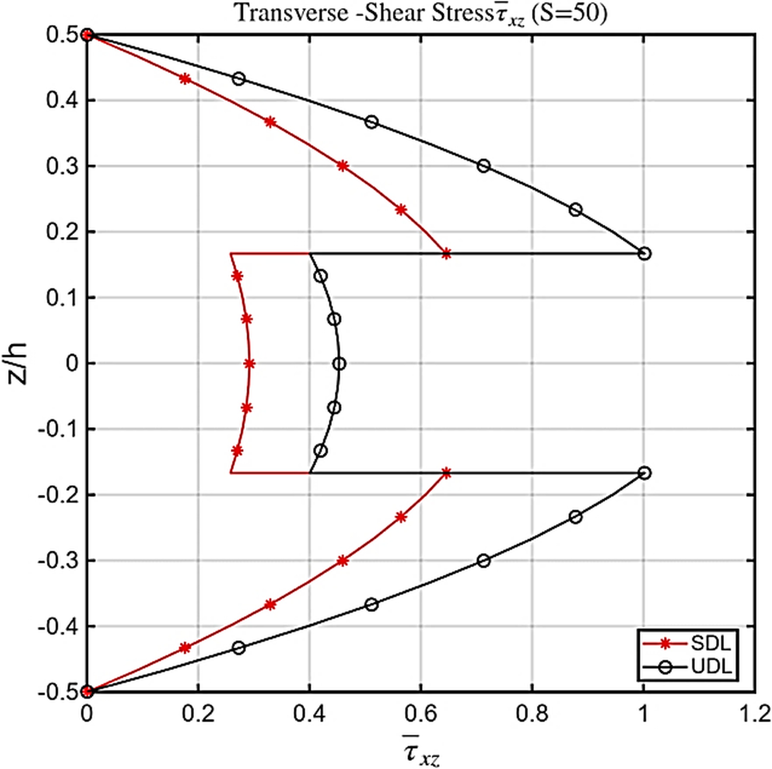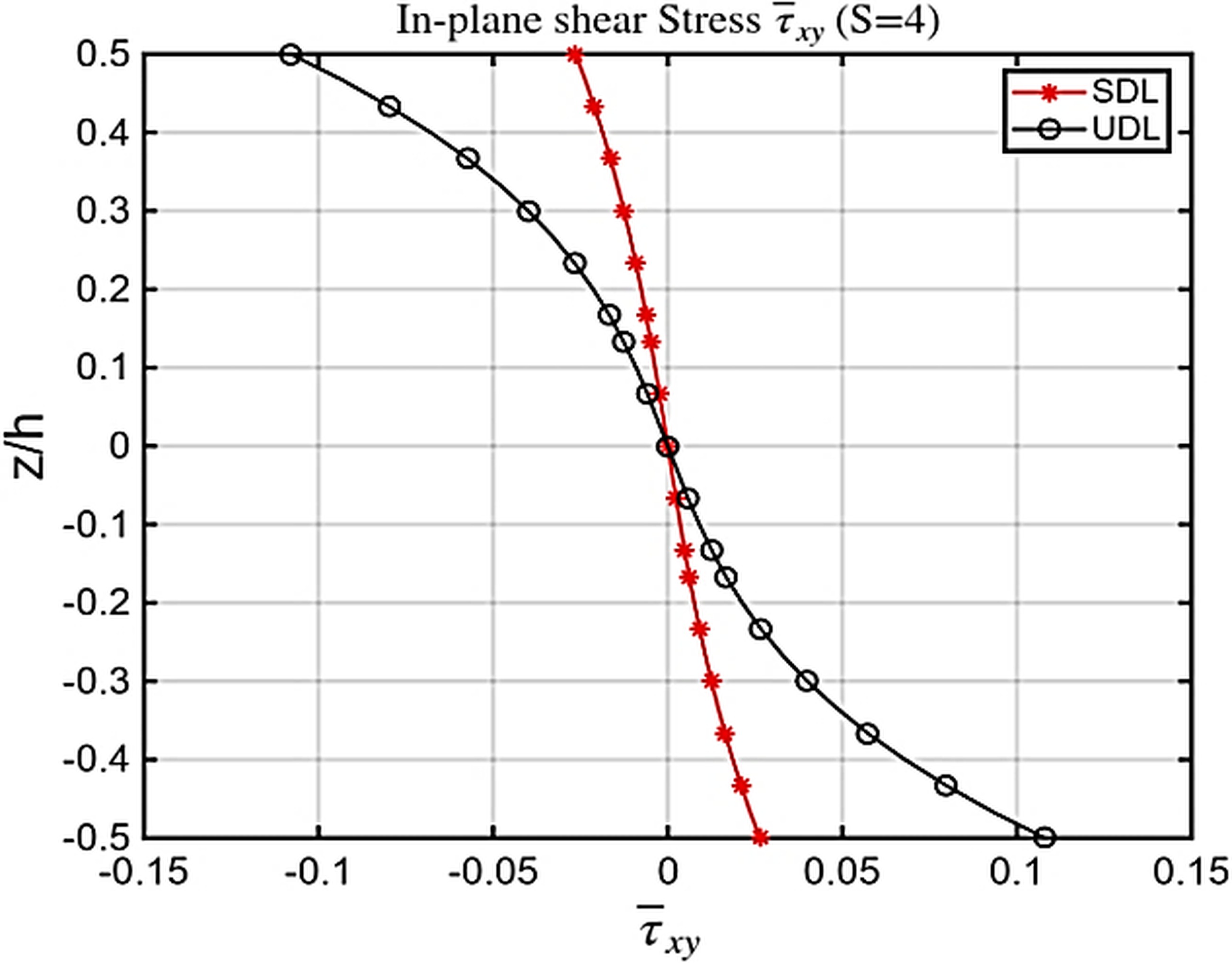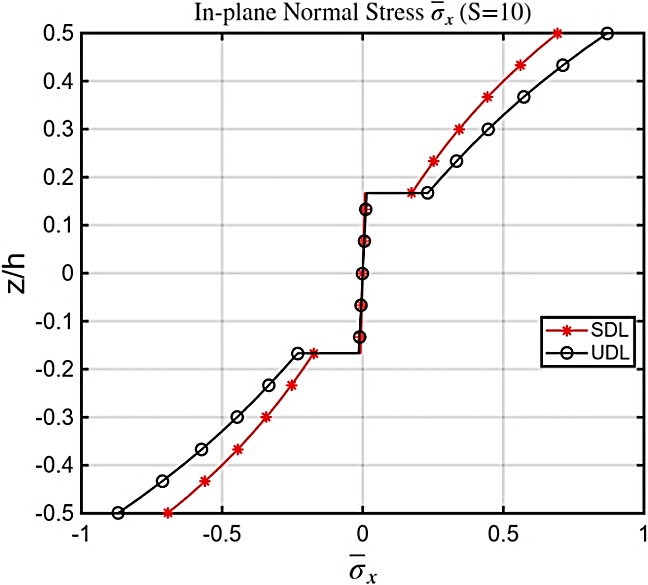 Both transverse and in-plane displacements predicted by nICSDT fall within the expected range of higher-order solutions, confirming that the proposed theory effectively captures the influence of symmetry on stiffness and stress behavior. Classical theories remain inadequate for these cases, substantially underestimating deflection and failing to represent the correct shear stress variation. For both sinusoidal (SDL) and uniformly distributed loads (UDL) at span ratios S=4 and S=10 (Tab. 5-8), the transverse displacements predicted by the nICSDT are slightly lower than those reported in [32] and [2], yet remain highly accurate. In contrast, the classical theory [3] significantly underestimates displacements, particularly for thicker plates, underscoring the necessity of higher-order models. The in-plane normal stresses σx(h/2)&σy(h/2) from nICSDT exhibit excellent agreement with exact solutions and other higher-order theories, whereas [1] and [3] under predict these stresses, especially σx, due to their limited ability to capture multi-layer bending effects. Transverse shear stresses τyz(0)are slightly lower than [1] when computed via constitutive relations but align closely with exact 3D solutions [31] when determined through equilibrium equations [3], however, fails to capture shear stresses entirely. Increasing the span ratio from S=4 to S=10 reduces transverse displacements relative to plate thickness and slightly lowers in-plane stresses—trends accurately captured by nICSDT, demonstrating its robustness across varying slenderness ratios. Additionally, UDL generates larger transverse displacements and slightly higher in-plane stresses compared to SDL, and the proposed theory effectively captures both the quantitative and qualitative differences. Overall, nICSDT consistently provides results closest to the exact 3D solutions, with deviations within 2–6%, outperforming [1] in stress predictions and [3] in deflection estimates, while results from [32] and [2] also remain reliable for symmetric laminated plates. Figs. 5-9 show variation stresses through the thickness of a (0/90/0) laminated plate under SDL & UDL at different aspect ratio. In Fig. 5 the τxy at top and bottom surface of plate in case of UDL found 5 times more than that of SDL. This is essentially due to boundary shear transfer Under UDL, the entire uniform load is transferred through the supports, creating much larger boundary shear forces, which results in significantly higher surface shear stresses. In contrast, SDL is zero at the edges, so very little shear is carried near the supports, giving much smaller top and bottom shear stresses. Similarly Figs.5-9. shows Variation of stresses through the thickness of plate in case of SDL are almost 1.5-2 times more than that of SDL. This is due to fact that SDL concentrates the load toward the center of the plate (center-concentrated curvature.), producing higher bending moments and sharper curvature compared to UDL.