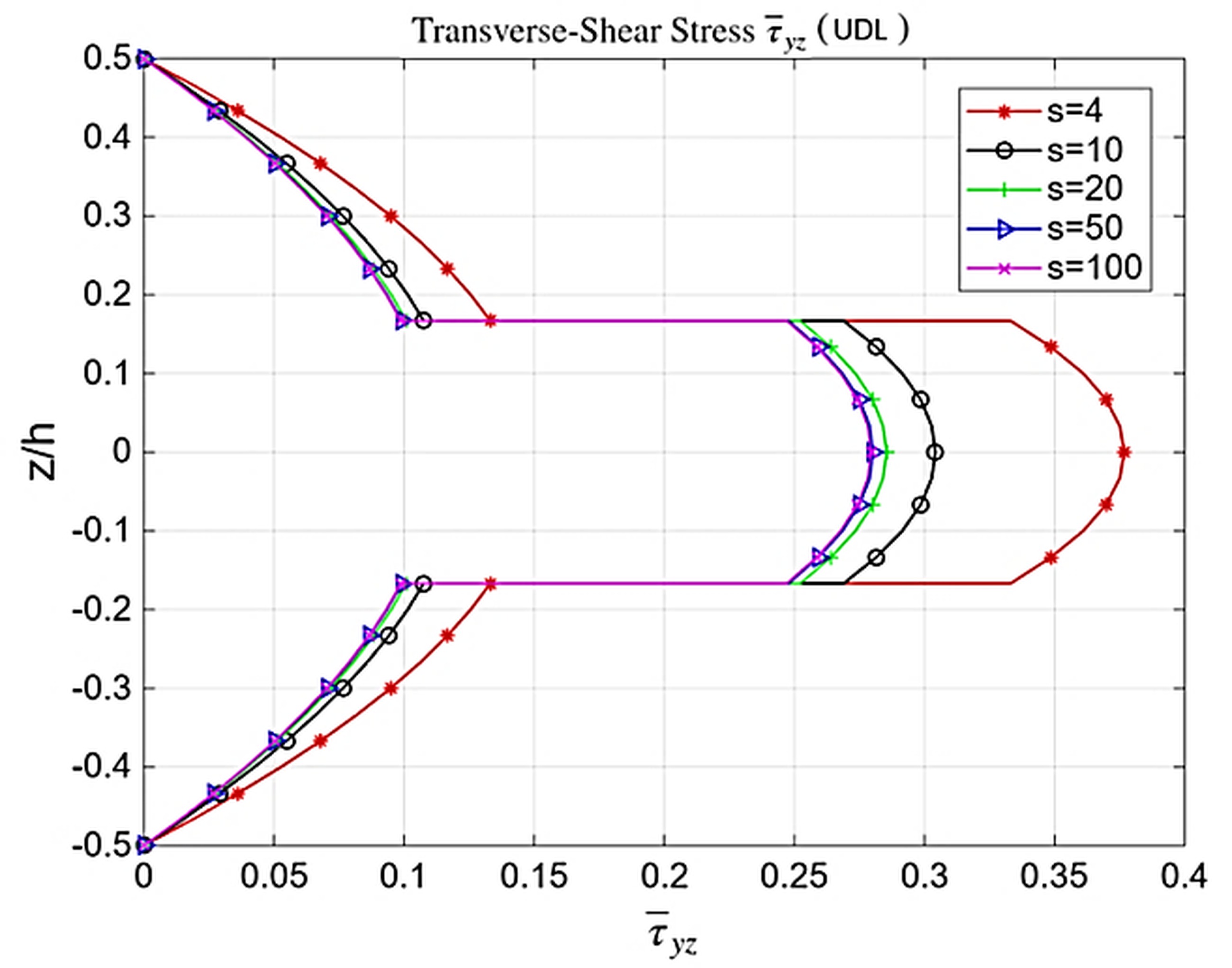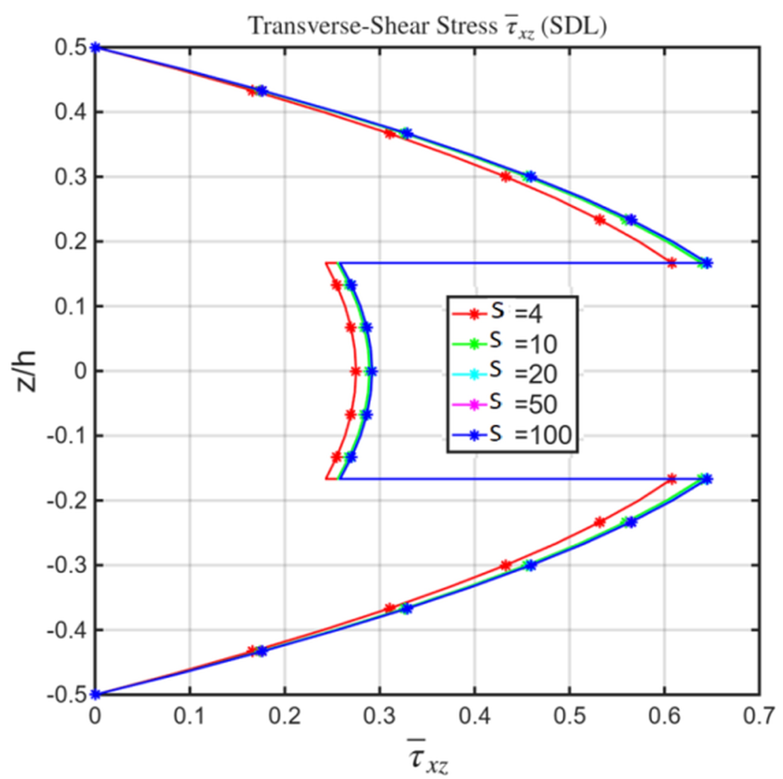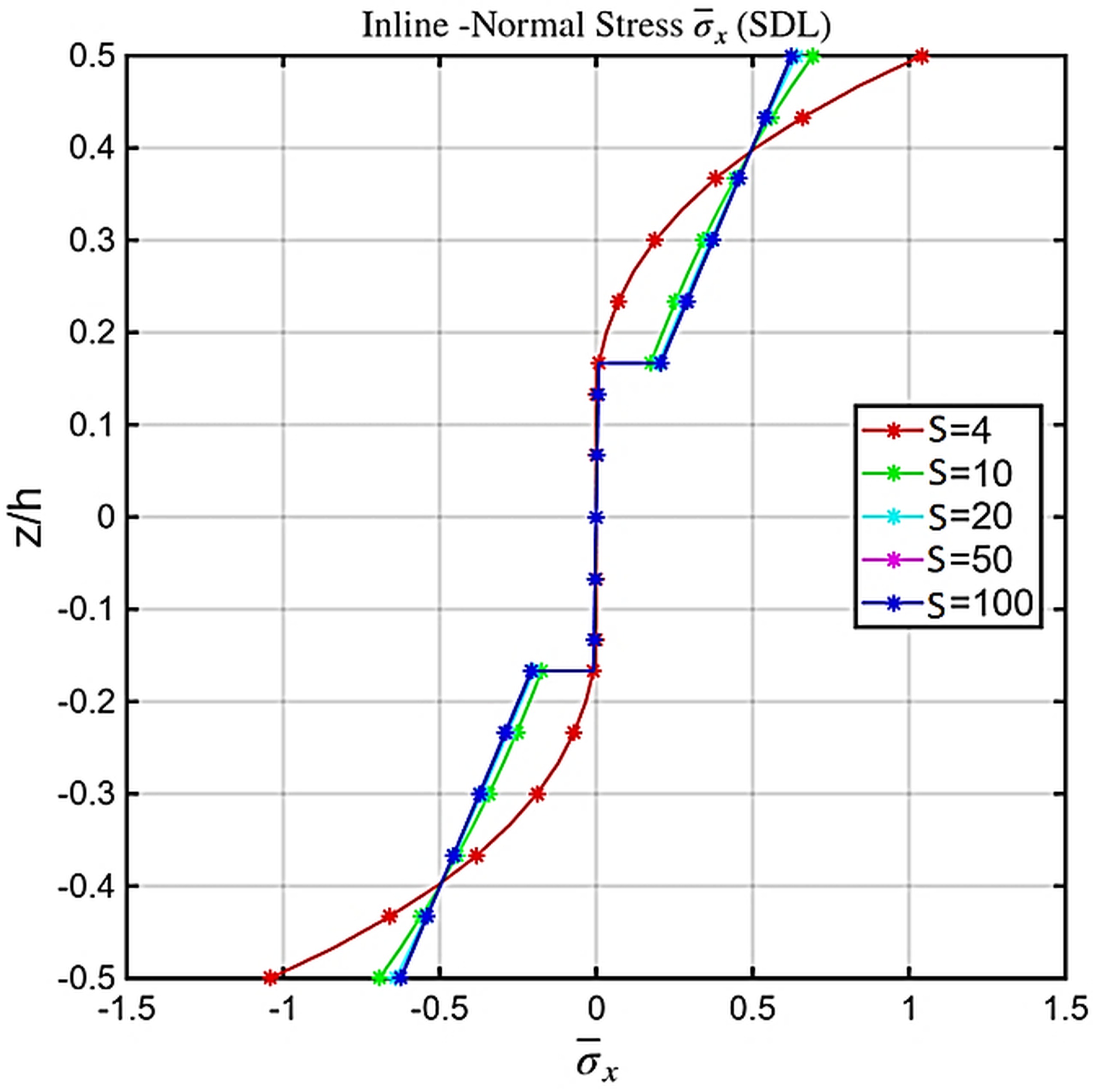 The symmetry of (0/90/0) laminate captured in all plots. The shear stress is zero at surfaces validates cotangent function. Fig. 9-11. Shows the plot explores the effect of increasing aspect ratio. For S = 4 (thick plate), stresses are higher and transverse-shear effects dominate, producing greater through-thickness curvature. As S increases to 10, 20, and 50, stresses decrease as shear influence diminishes. For S = 100, the response approaches the thin-plate limit, with flatter stress profiles and minimal shear effects. The theory smoothly shifts from thick-plate behavior, where shear dominates, to thin-plate behavior, where bending dominates. Figs. 9–11 show that the proposed model accurately captures shear-dominated behavior at low S and the expected bending-dominated response at high S.