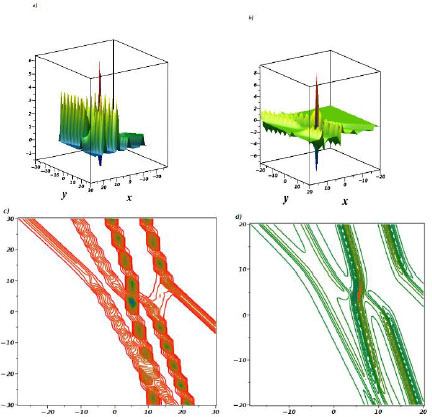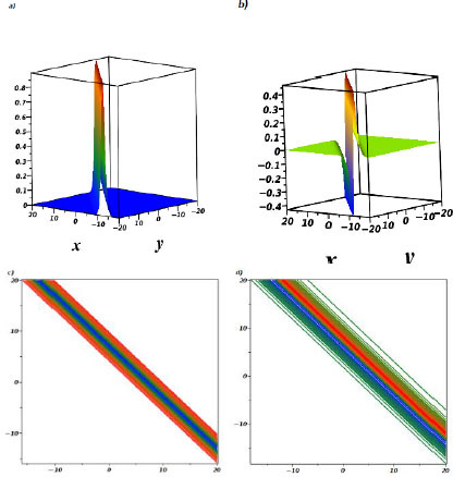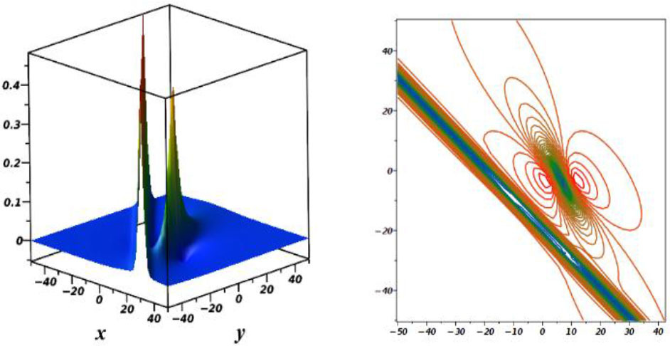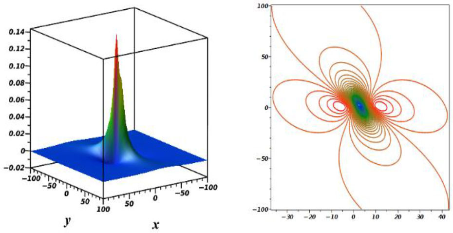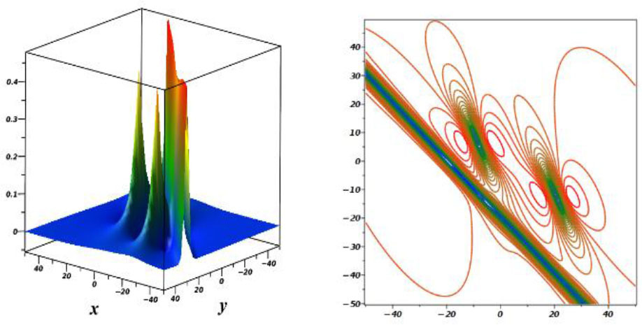 where with dispersion relation and whereHere km, lm, jm, wm, λm, are constants, whereas Ωm defines as the functions dependent on x, y, z, t. Now, to address the M-lump wave solution, we apply the long-wave method by taking N = 2, and assuming, km → 0, eλm = –1, and