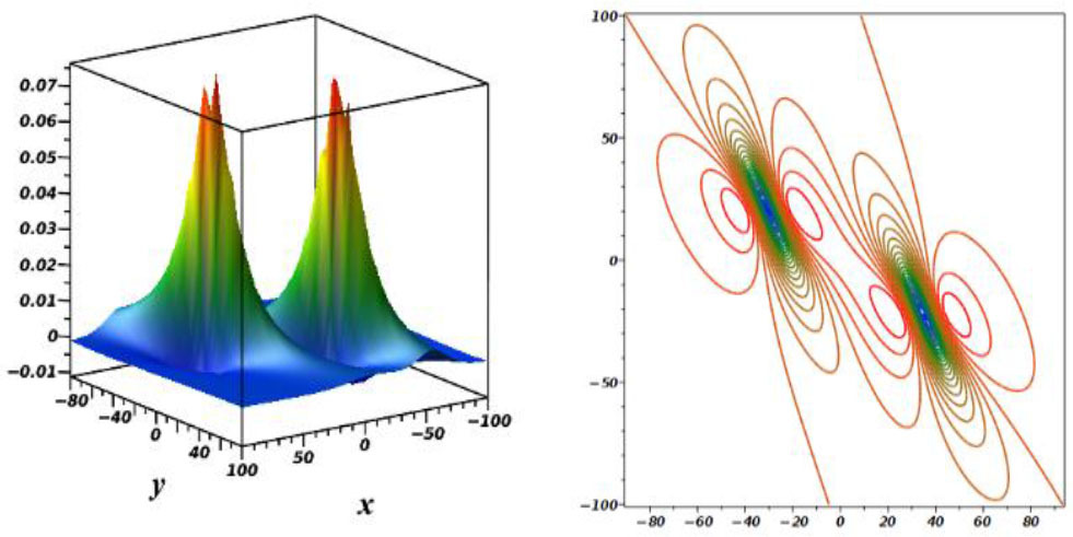 where Φ1, Φ2, Φ3, Φ4, wm and Bmn(n < m) are explained with Eqs. (13), (14), and Eq. (15), respectively. The double-lump solution is obtained by combining equation (17) with the other findings in equation (5) and demonstrated in Figure 3.Fig. 3.