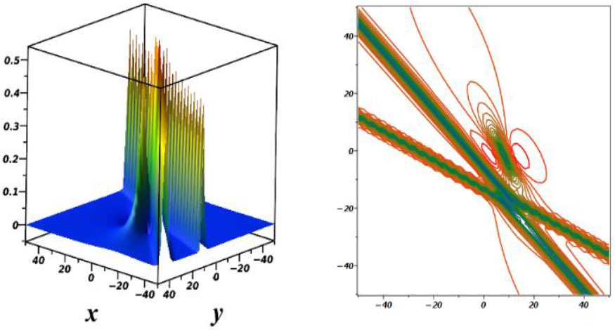 Eq. (22) can be substituted into Eq. (5) to provide a result that combines the properties of a double-soliton solution and a single-M-lump solution (refer to Fig. 6).